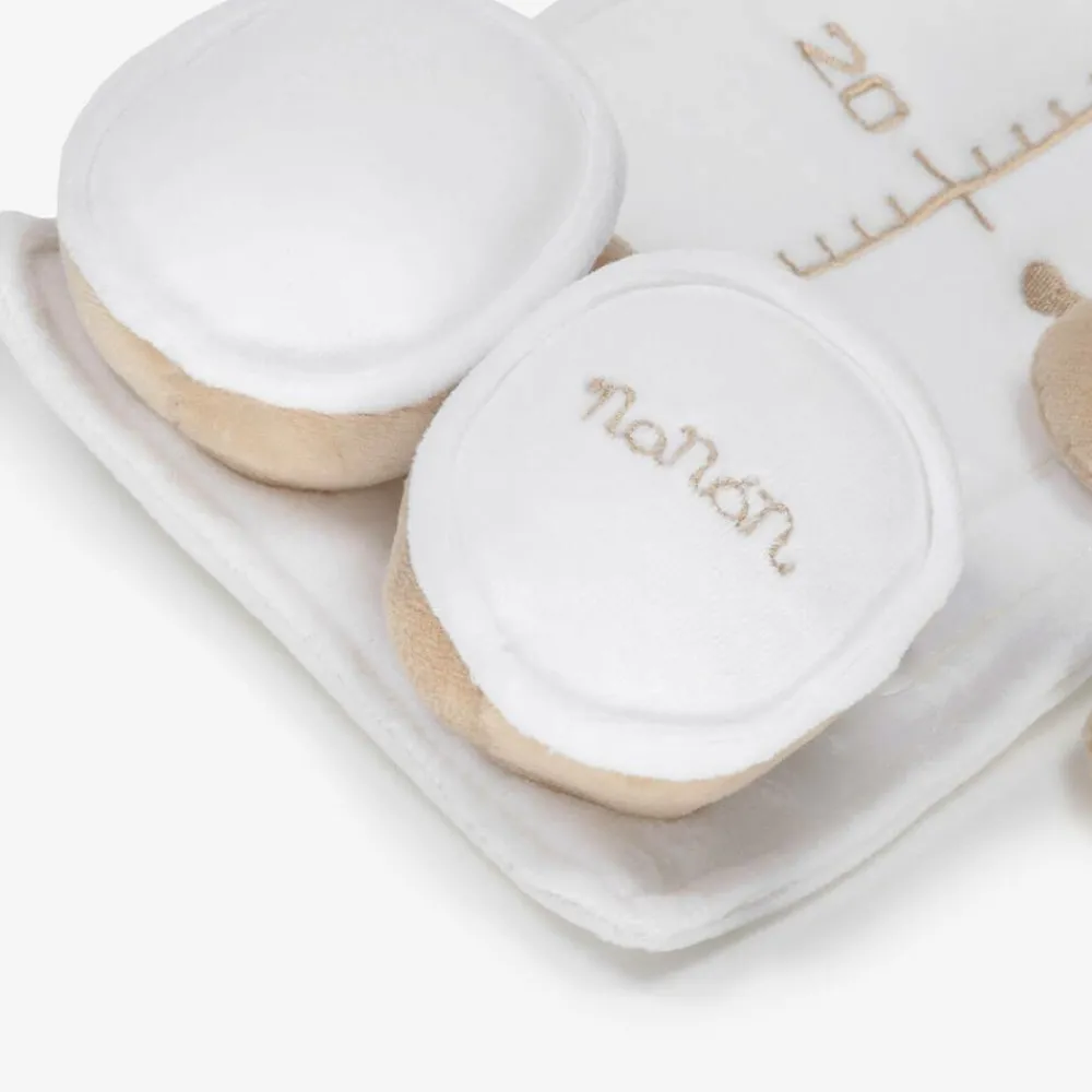 A sweet beige and white teddy bear height chart for baby boys and girls, by Nanán. Soft and gently padded, this nursery accessory is a super cute design with embroidered measurements and heart motifs. A fun way to measure and track baby's growth, it comes with two moveable markers that attach to velcro down one side.