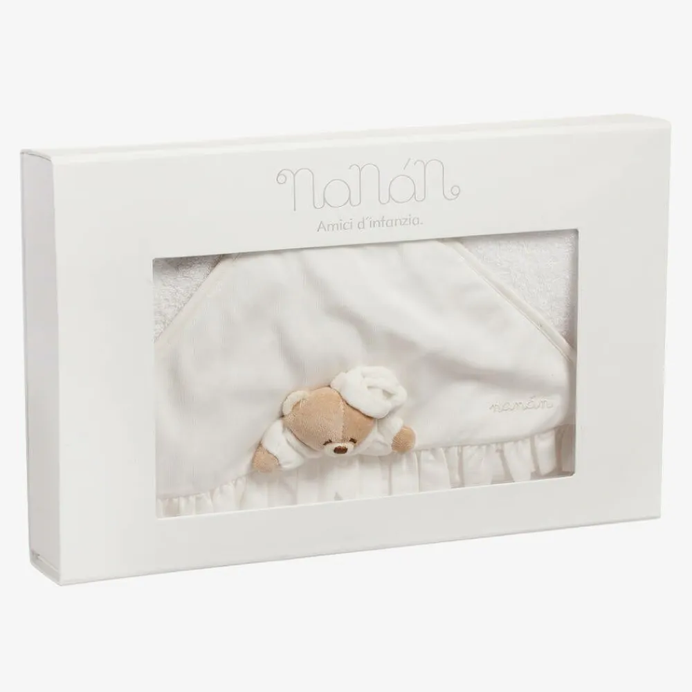 A white and ivory hooded towel for baby boys and girls by Nanán, made from soft cotton towelling. Ideal for bath time, this gentle towel has narrow ivory trims and a decorative frill on the hood. The soft teddy bear appliqué adds a cute finishing touch. It comes in a branded gift box, making a lovely present for a new addition.