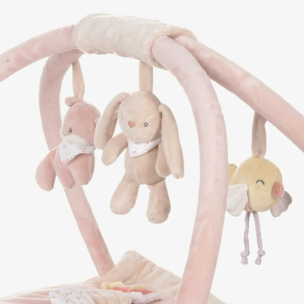 Lovely pink playmat for baby girls by Nattou, made in luxuriously soft plush. Padded for comfort, this fun play accessory includes over twenty five activities for your little one. From crackling paper and rattles to squeakers and silicone rings, it supports children's curious nature, engages all of their senses, and promotes development of their dexterity and fine motor skills. The arches have adorable rattle and squeaker hanging toys, and attach simply onto the mat with easy-to-use buckle clips.