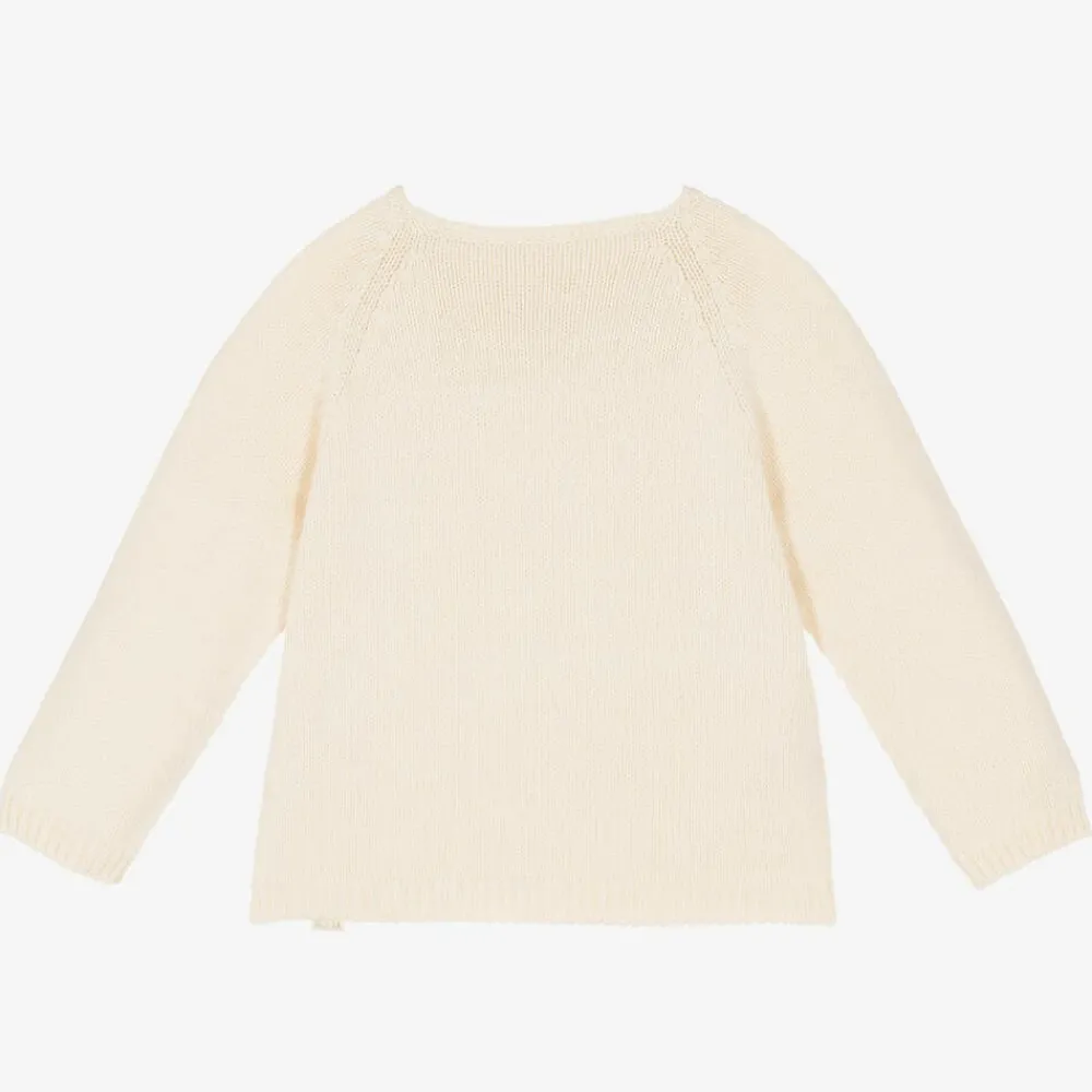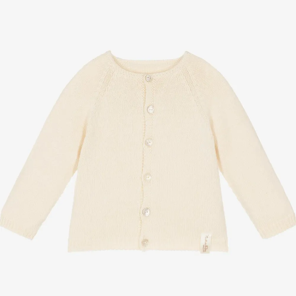 Ivory cardigan by Naturapura, suitable for both baby boys and girls. Made in soft, knitted organic cotton, it has pretty mother-of-pearl button fastenings with ribbed trims.