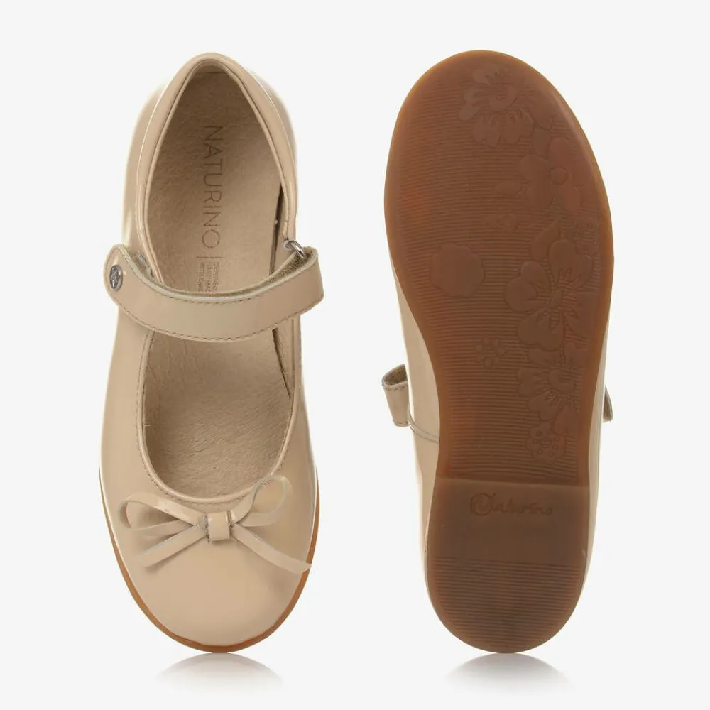 Charming cream patent leather ballerina pumps for girls by Naturino. Designed using the brand's exclusive Sand Effect system, they ensure just the right support for growing feet and are lined in soft leather with lightly padded insoles for comfort. They secure on the foot with a velcro fastening strap and are trimmed with a sweet tonal bow on the front.