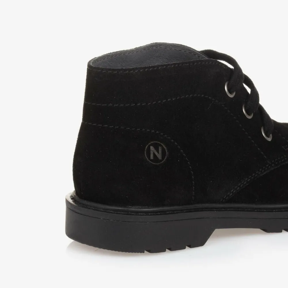 Black ankle boots for boys by Naturino, made in soft suede leather. Designed using the brand's exclusive Sand Effect system, they ensure just the right support to growing feet. Lined in smooth leather with lightly padded insoles for comfort, they fasten with laces, and have treaded rubber soles for good grip.
