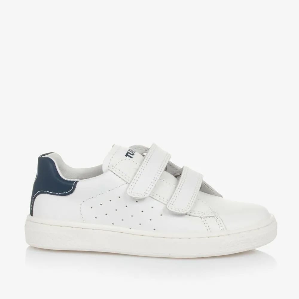 White trainers for boys by Naturino, made in smooth leather with a perforated side panel. Fastening with velcro straps, this casual style has a navy blue heel panel with a coordinating blue logo stamped on the tongue. They are lined in soft leather, with a cushioned insole ensuring comfort and a flexible, non-slip rubber outer sole providing good grip.