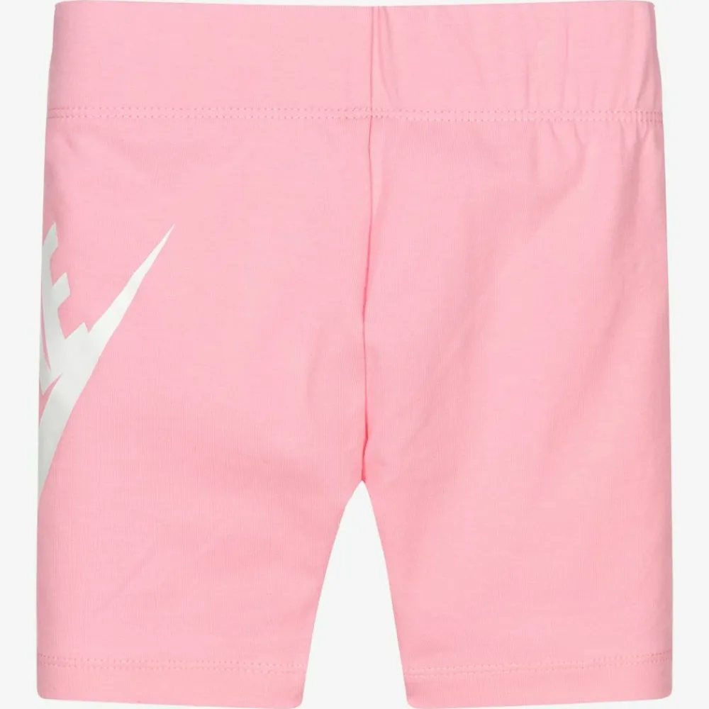 Pink cotton jersey cycling shorts for girls by Nike, with a white Swoosh logo print on one side.