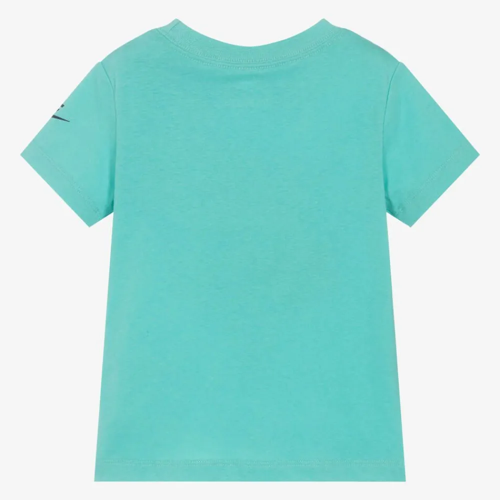 Turquoise green T-shirt for girls by Nike, made in a soft, lightweight cotton-blend jersey. Casual and comfortable, this short-sleeved top features the brand's iconic Swoosh logos in purple on the front and on one sleeve for a distinctive branded finish.