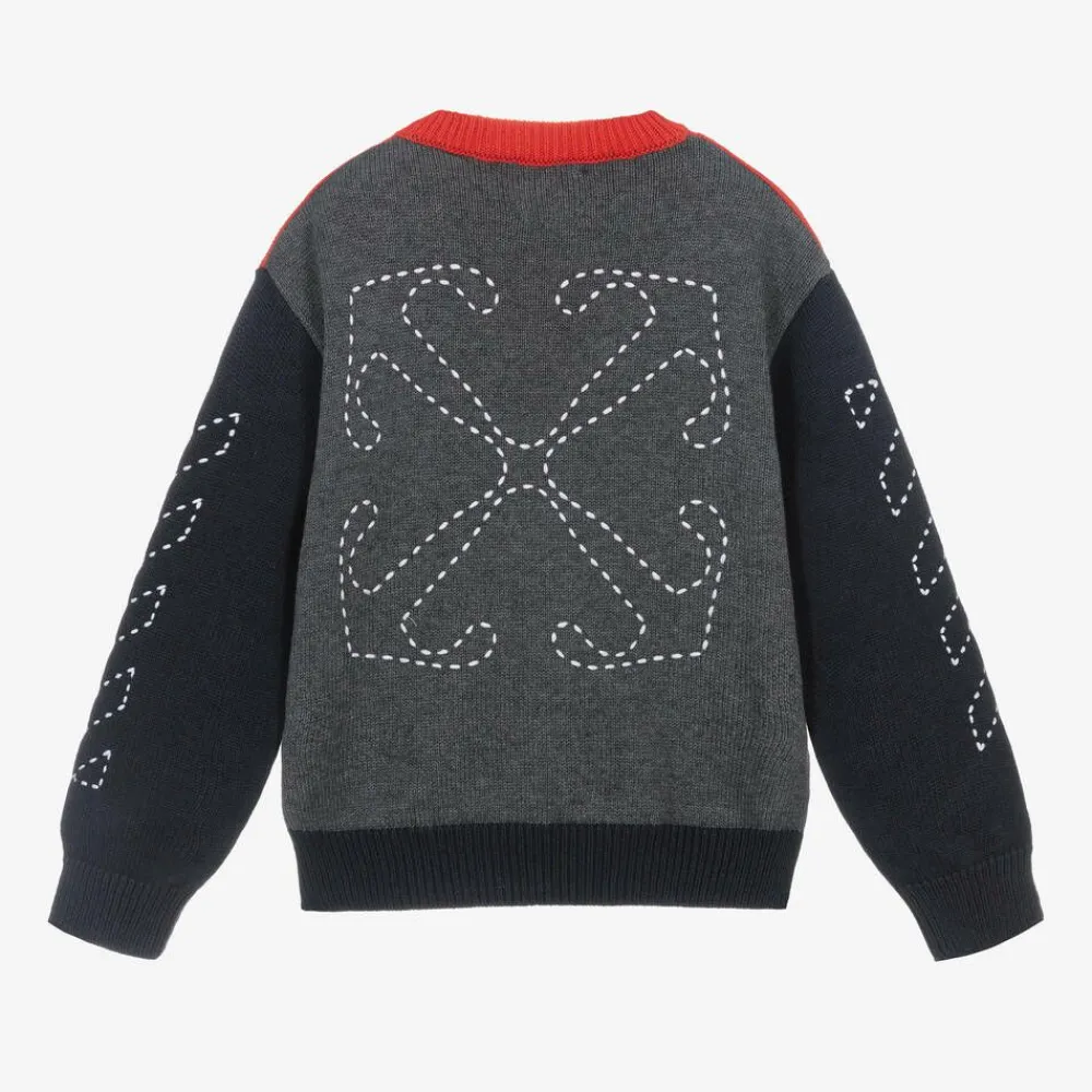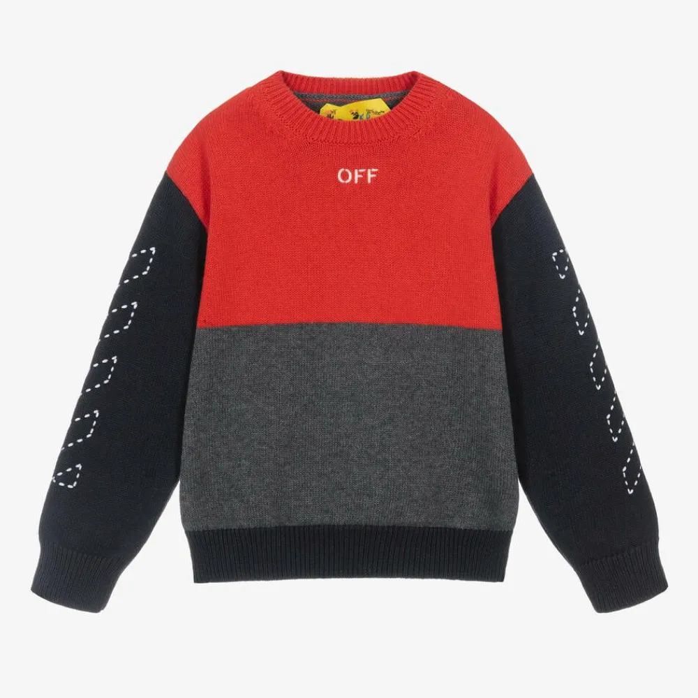 In red, grey and navy blue, this colourblock sweater for boys is by Off-White. Cosy and comfortable, it is knitted in a soft cotton and wool blend. The brand's stitch embroidery is featured on the back and sleeves, with their signature Off Stamp logo on the chest.