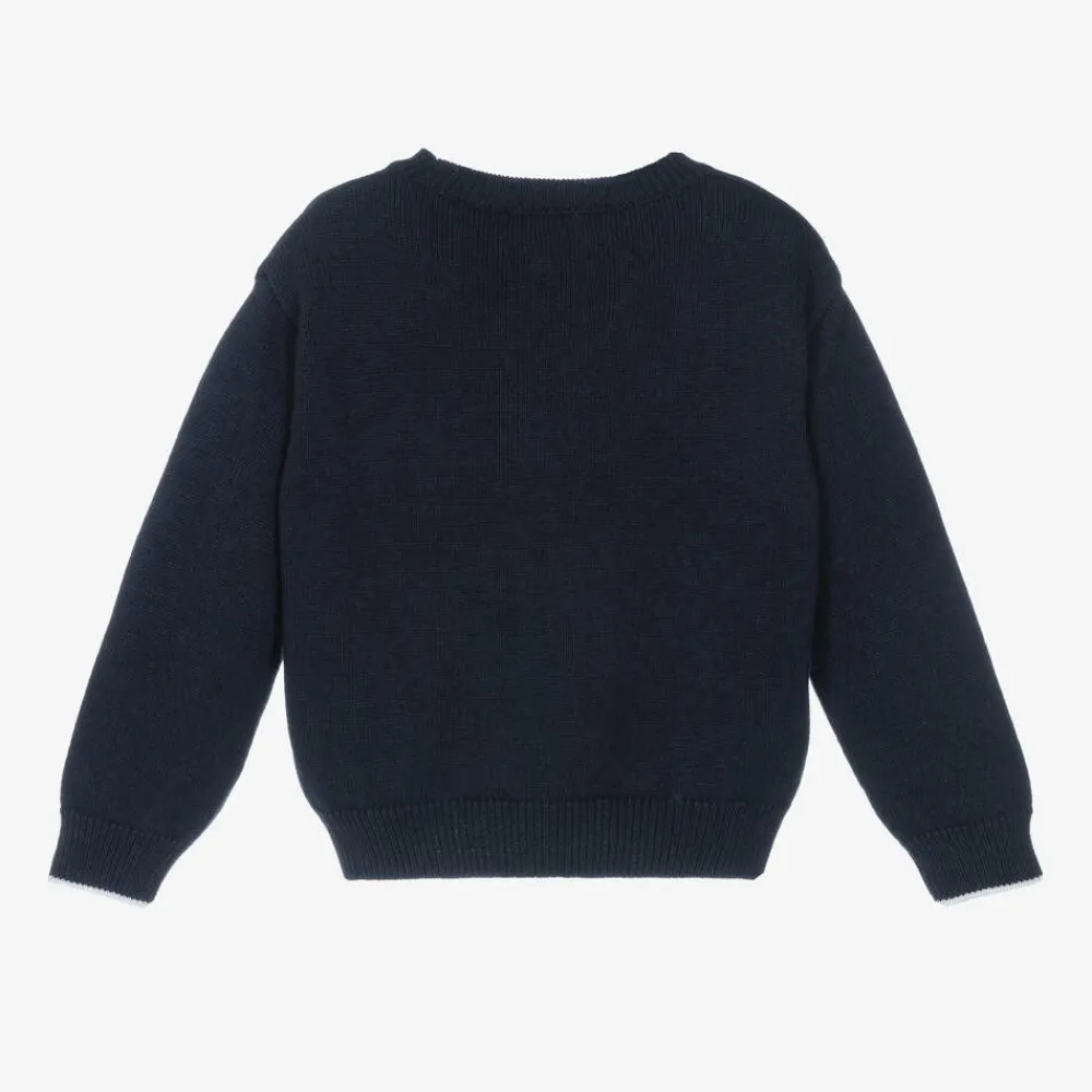 Navy blue sweater for boys by contemporary luxury brand, Off-White. Knitted in a soft cotton and wool blend, this cosy layer is simple and understated. It is embroidered with the iconic Bookish logo on the front in white for instant designer appeal.