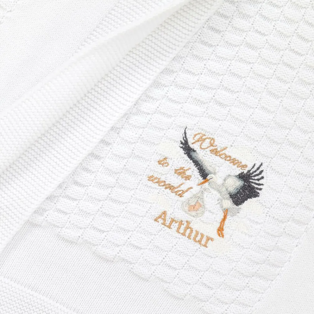 Personalised white blanket for baby boys and girls by Paint My Dreams, designed in the British countryside. Knitted in soft, lightweight cotton, it has delicate 'Welcome to the World' embroidery on one corner, with an adorable stork and your little one's name. Ideal as a thoughtful gift for a special new arrival, this nursery accessory comes beautifully presented in a gift box.
