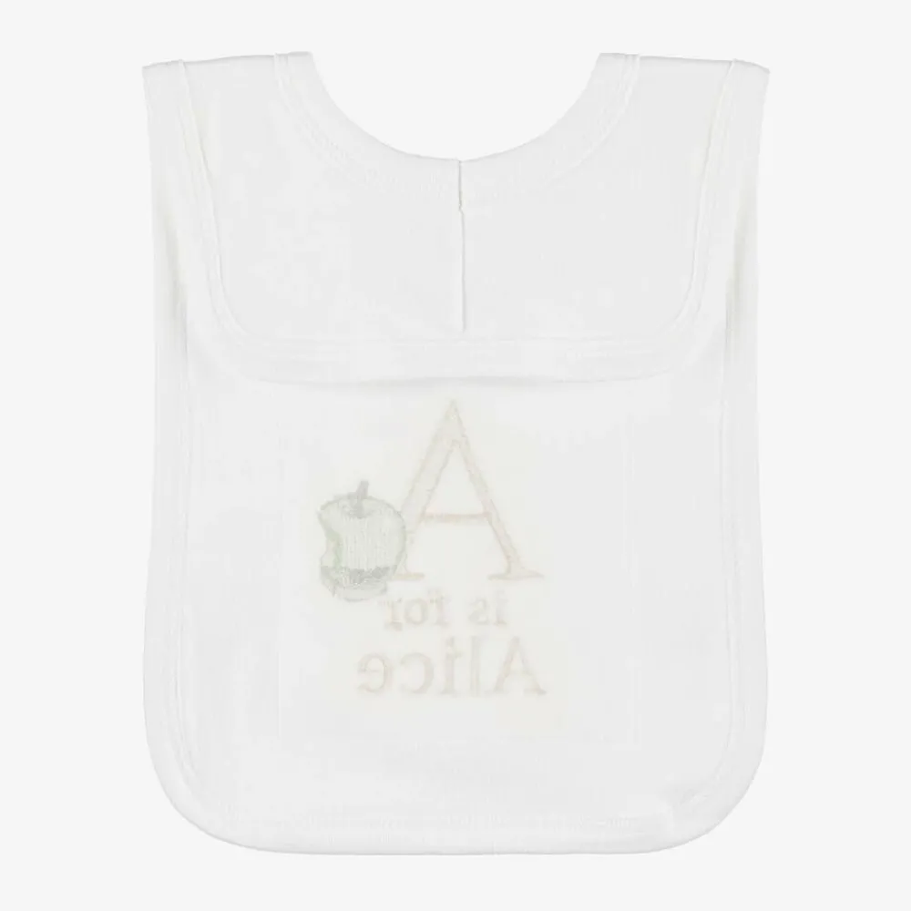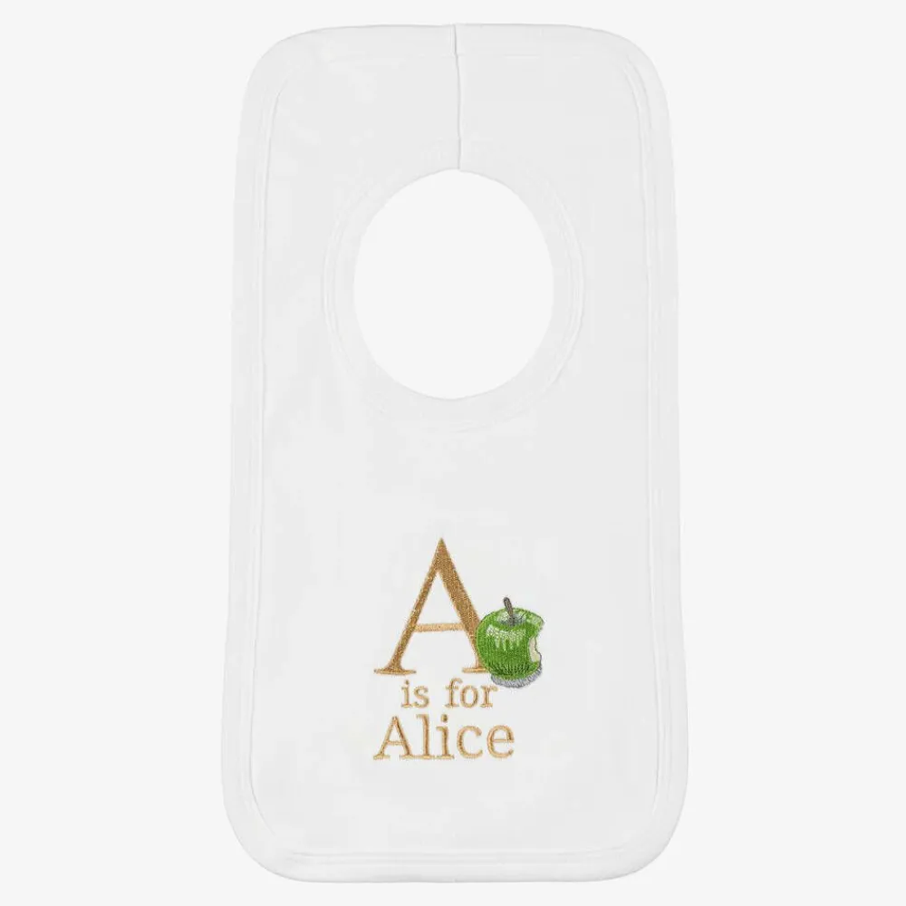 Cute white bib for baby boys and girls by Paint My Dreams, the British label. Made in soft cotton jersey for gentle comfort against delicate skin, this useful feeding accessory is ideal for catching small spills and dribble, and simply slips on over the head. Your little one's name can be embroidered below the 'A' initial and sweet apple motif, making a thoughtful gift.