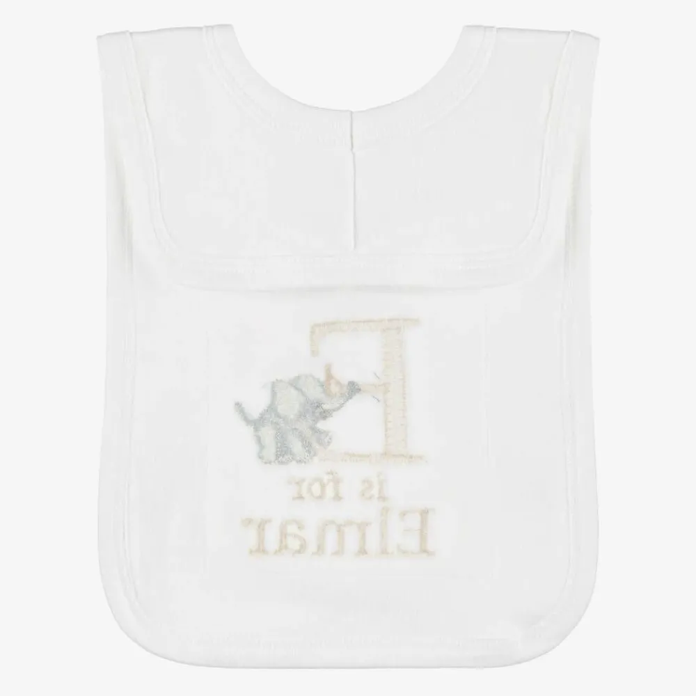 Cute white bib for baby boys and girls by Paint My Dreams, the British label. Made in soft cotton jersey for gentle comfort against delicate skin, this useful feeding accessory is ideal for catching small spills and dribble, and simply slips on over the head. Your little one's name can be embroidered below the 'E' initial and sweet elephant motif, making a thoughtful gift.