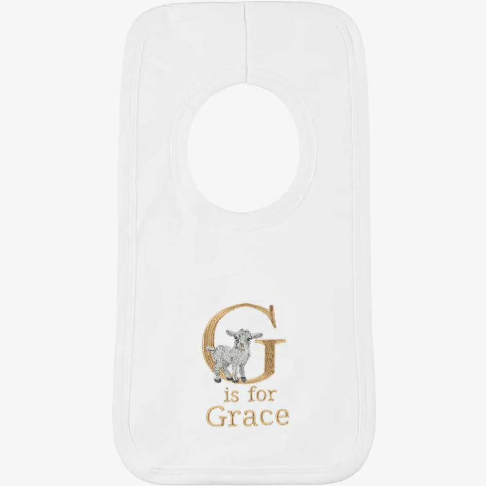 Cute white bib for baby boys and girls by Paint My Dreams, the British label. Made in soft cotton jersey for gentle comfort against delicate skin, this useful feeding accessory is ideal for catching small spills and dribble, and simply slips on over the head. Your little one's name can be embroidered below the 'G' initial and sweet goat motif, making a thoughtful gift.