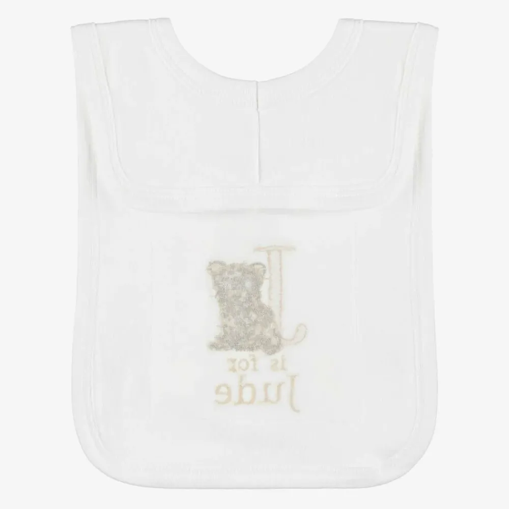 Cute white bib for baby boys and girls by Paint My Dreams, the British label. Made in soft cotton jersey for gentle comfort against delicate skin, this useful feeding accessory is ideal for catching small spills and dribble, and simply slips on over the head. Your little one's name can be embroidered below the 'J' initial and sweet jaguar cub motif, making a thoughtful gift.