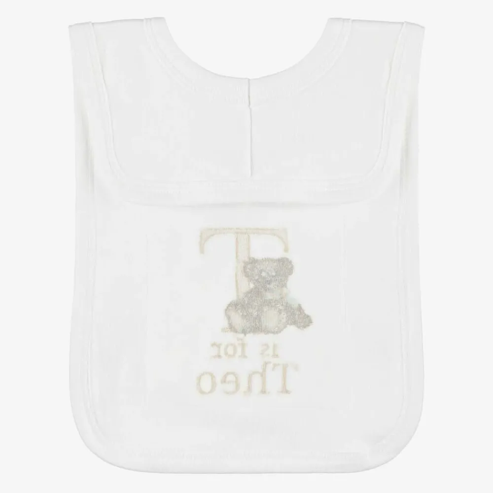 Cute white bib for baby boys and girls by Paint My Dreams, the British label. Made in soft cotton jersey for gentle comfort against delicate skin, this useful feeding accessory is ideal for catching small spills and dribble, and simply slips on over the head. Your little one's name can be embroidered below the 'T' initial and sweet teddy bear motif, making a thoughtful gift.