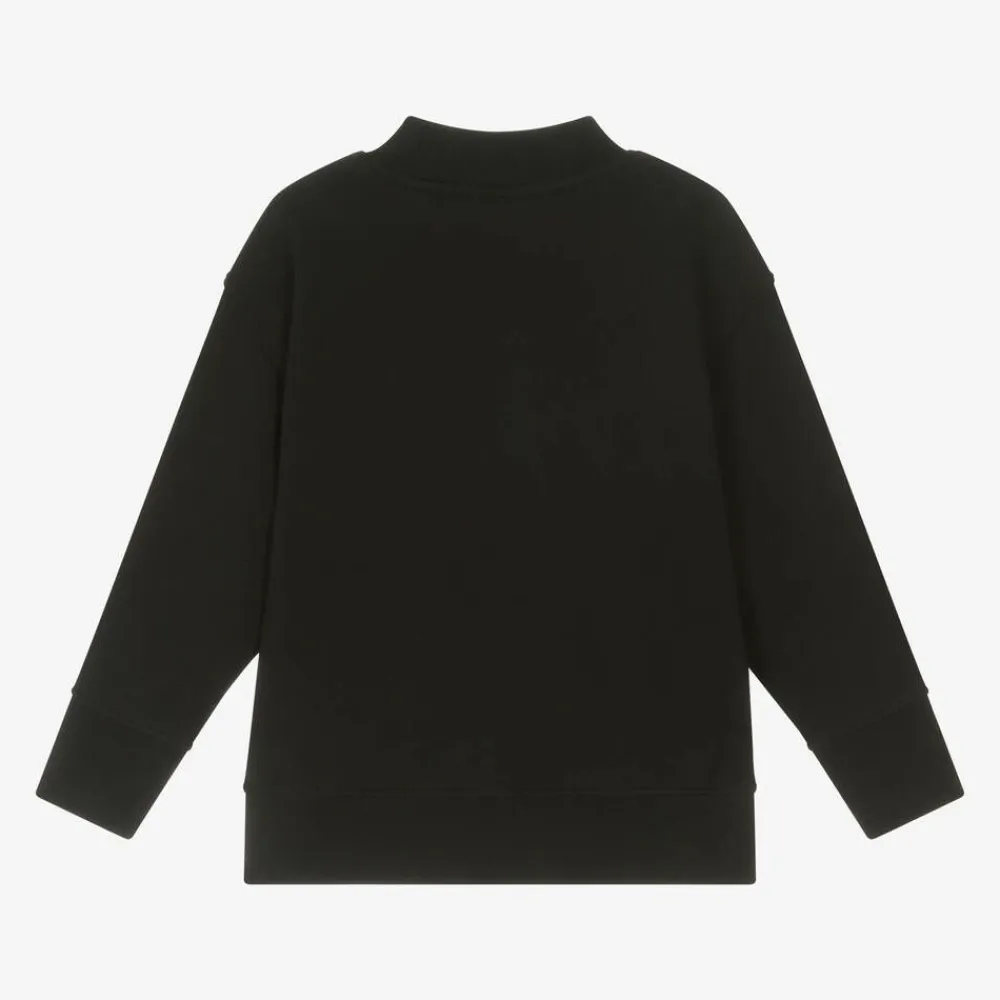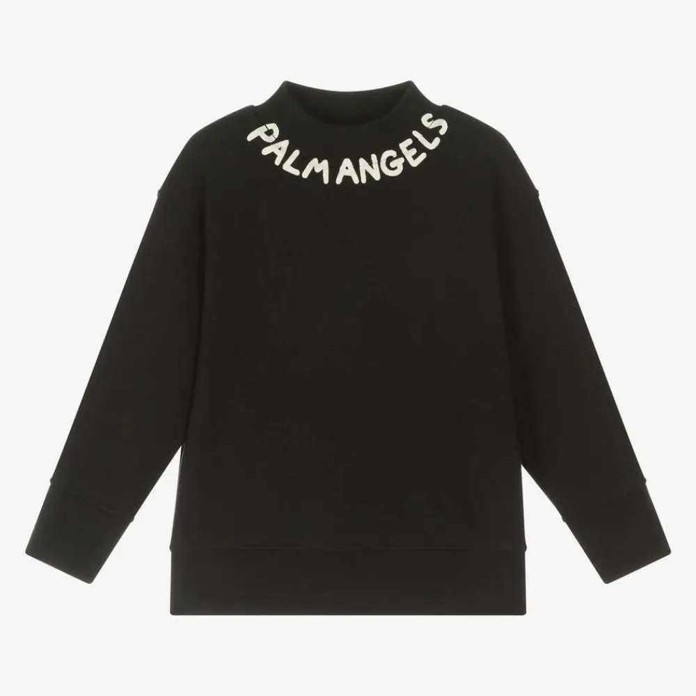 Black cotton sweatshirt for boys by Italian brand Palm Angels. It has an ivory screen-printed logo around the turtleneck, with a hand-painted effect. Made in comfortable, mid-weight jersey with a warm, fleecy inside, it has deep, ribbed trims for extra cosiness.