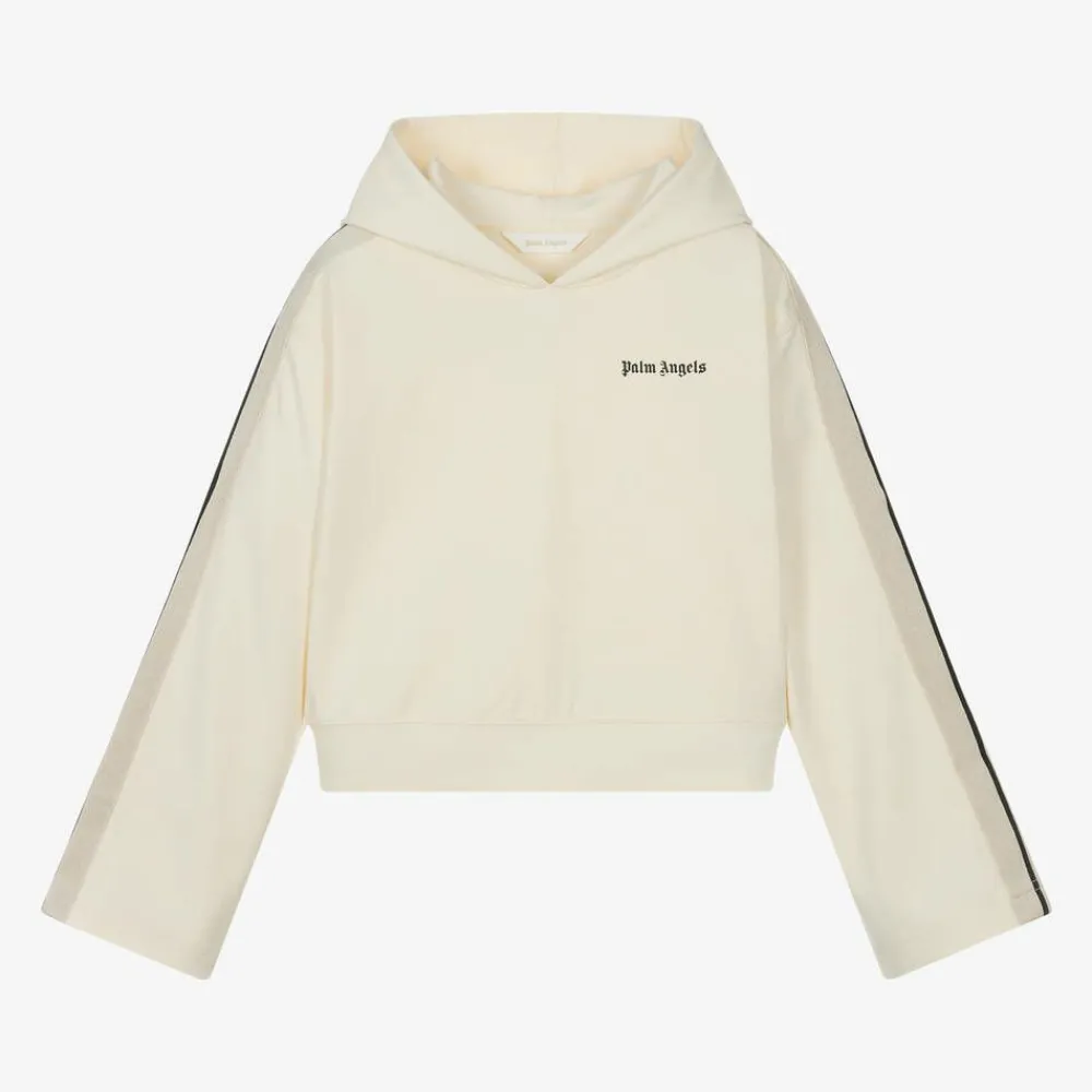 Ivory hoodie for older girls by Palm Angels, made in soft Milano jersey for comfortable wear. It is designed in a stylish boxy fit, with wide beige and black taping along the sleeves adding a cool, sporty touch. The brand's logo is stamped on the chest in black, for a distinctive designer finish.
