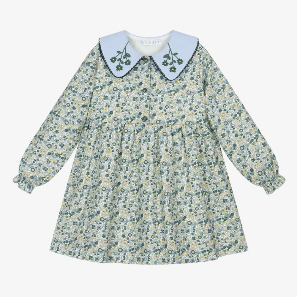 A blue dress for girls by Spanish brand Paloma de la O. It is made in soft cotton twill and patterned in a pretty floral print in shades of blue and pastel chartreuse green. It has a contrasting blue, Oxford cotton collar, trimmed in delicate lace and decorated with beautiful floral embroidery. Lined in lightweight voile for comfort, this traditional style has frilly cuffs on the long sleeves and fastens with tonal buttons on the front.