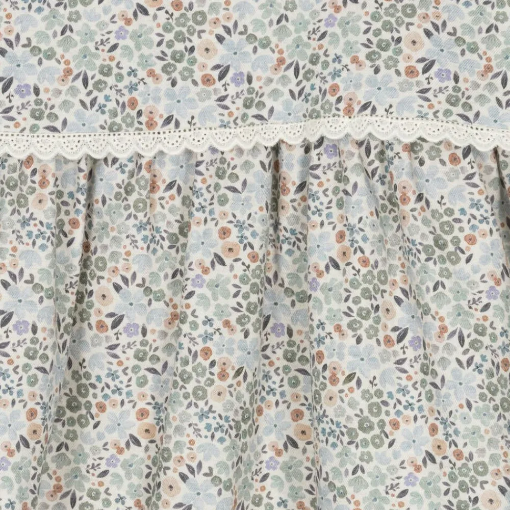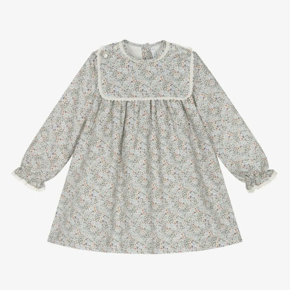 A traditionally styled, long-sleeved dress for girls by Spanish brand Paloma de la O. Made in soft cotton twill, the ivory background is patterned in a pretty floral print in blue, green and beige. The frilly cuffs and classic bib front are edged in scalloped lace, with decorative buttons at the shoulders. Lined in lightweight voile for comfort, this charming dress fastens with buttons on the back.