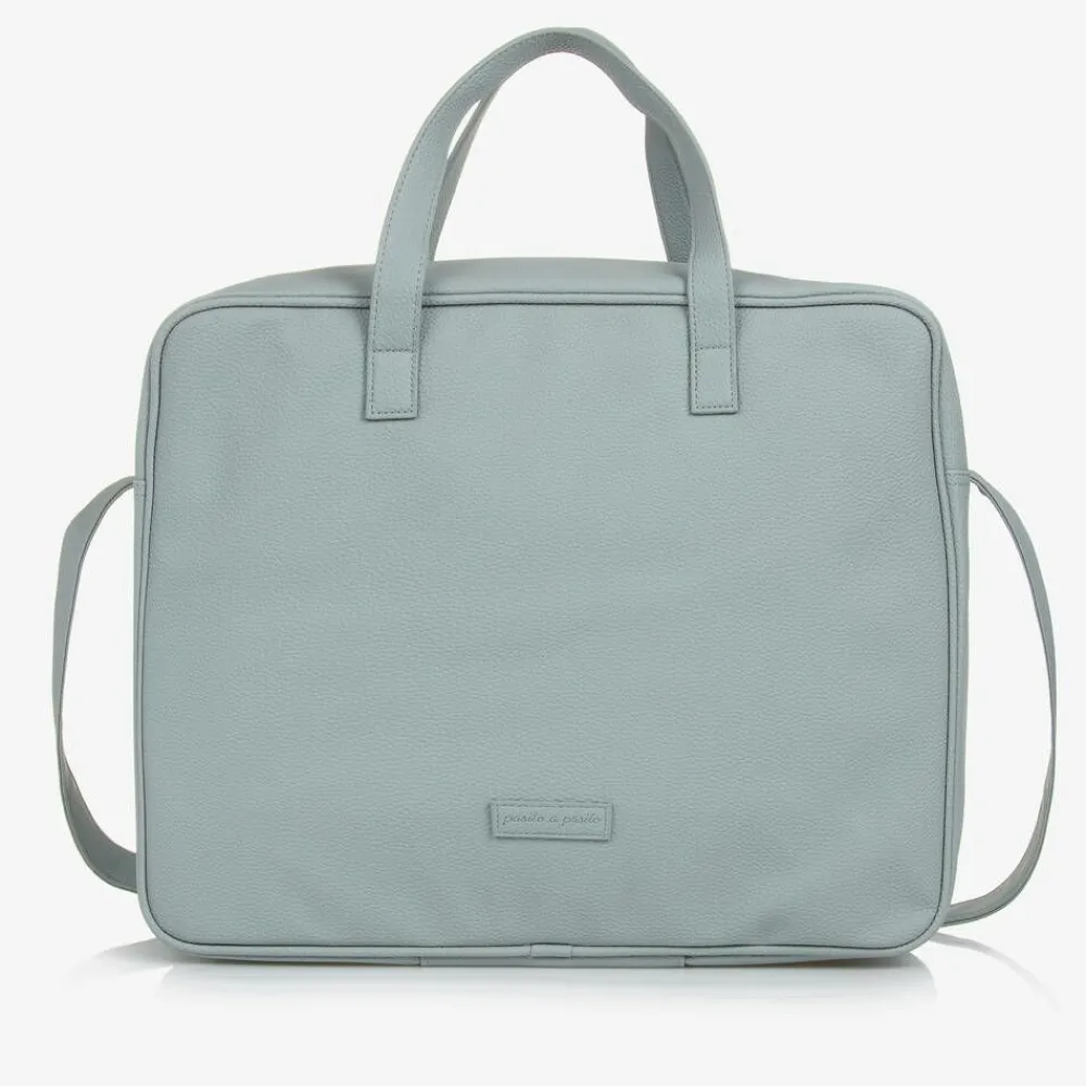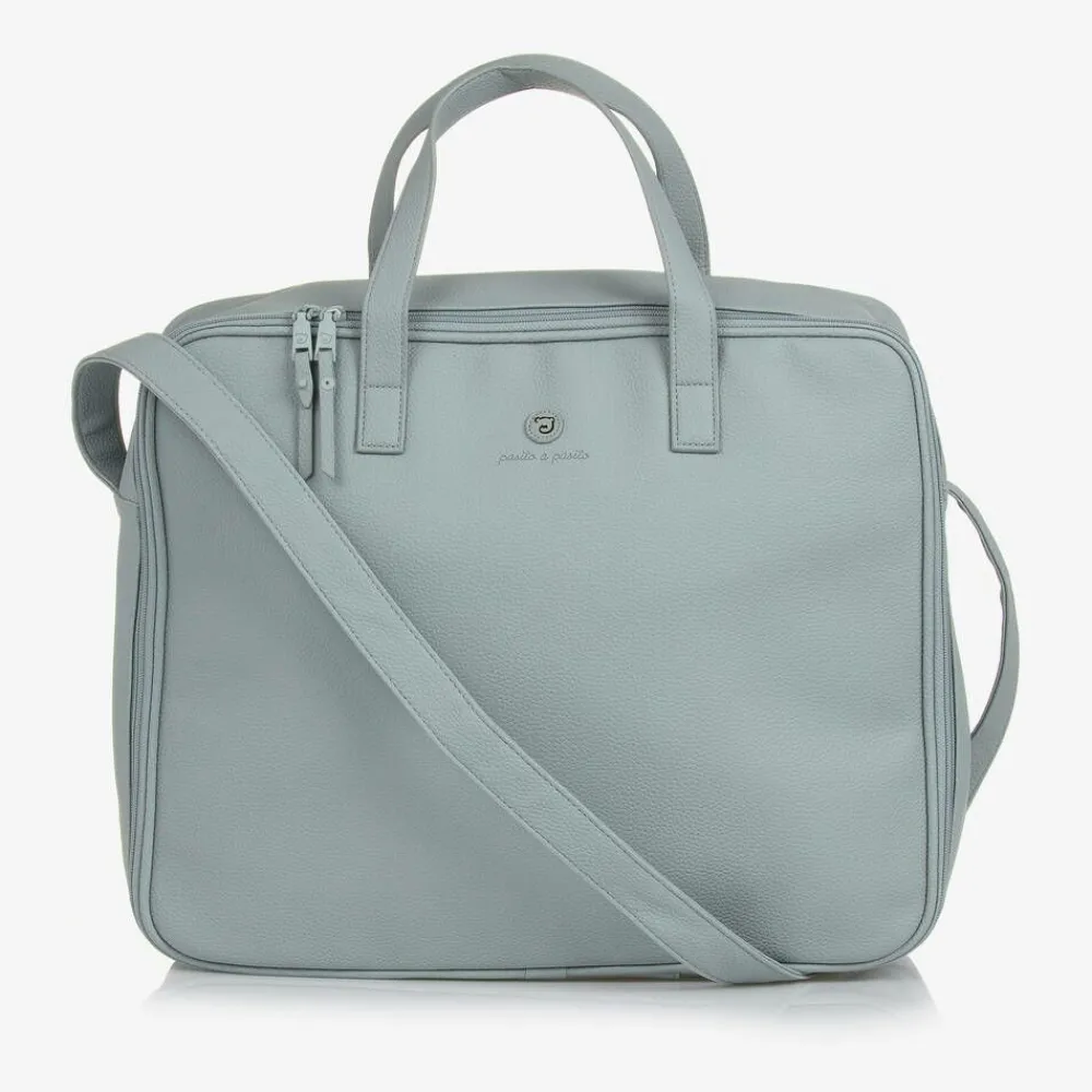 A green suitcase by Pasito a Pasito, made from pebbled faux leather. This large zip-up bag is ideal for hospital or overnight stays, with elasticated side pockets, a zip-fastening mesh pocket and stretchy clip straps on the inside to organise all your maternity essentials. It has easy-to-hold handles and a long strap that fits neatly on a pram.