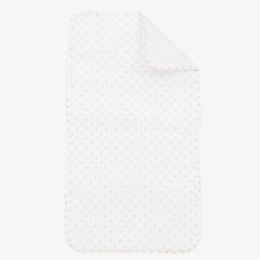 Stylish ivory changing bag by Pasito a Pasito, made in grained faux leather with an embossed logo on one side. This practical style is fully washable, with a branded satin lining, useful internal and external pockets for organising belongings, and a secure zip fastening. There are useful carry handles and the shoulder strap can be converted to stroller straps using poppers. It comes with a lightly padded changing mat with a soft towelling surface and a cute silver metal teddy charm completes the look.