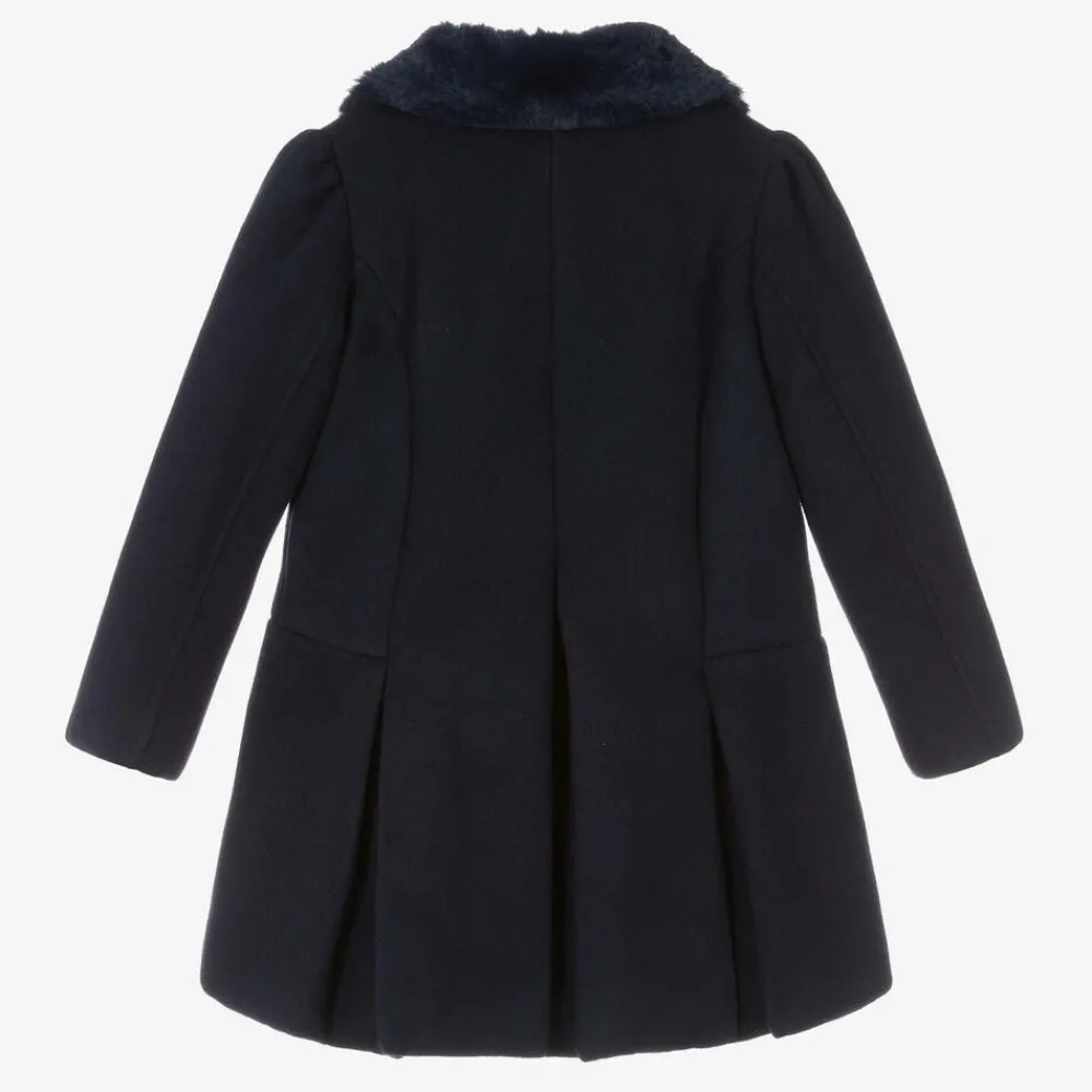 Exclusive to Childrensalon, this traditional navy blue coat for girls is from Patachou. It is made in a softly felted fabric with lightweight padding and a silky smooth lining. The faux fur collar, pleated skirt and pearlescent logo are lovely for heritage styling. Buttons fasten neatly at the front.