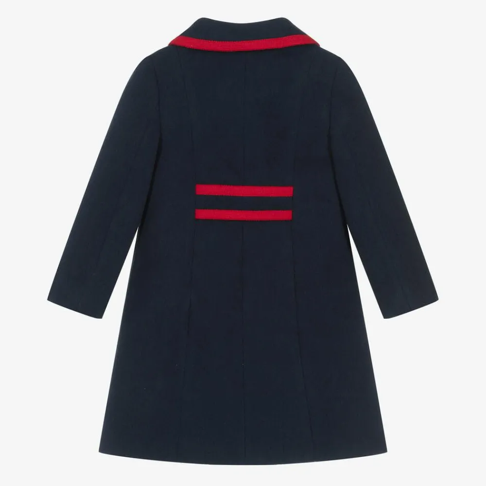 Smart navy blue coat for girls by Portuguese brand Patachou, with red trim for an eye-catching touch. Styled with a martingale belt on the back, this traditional design is made in soft felted fabric for a cosy feel, with a satin lining for comfort. It fastens with gold-tone crest buttons, matching the decorative buttons on the front pockets.
