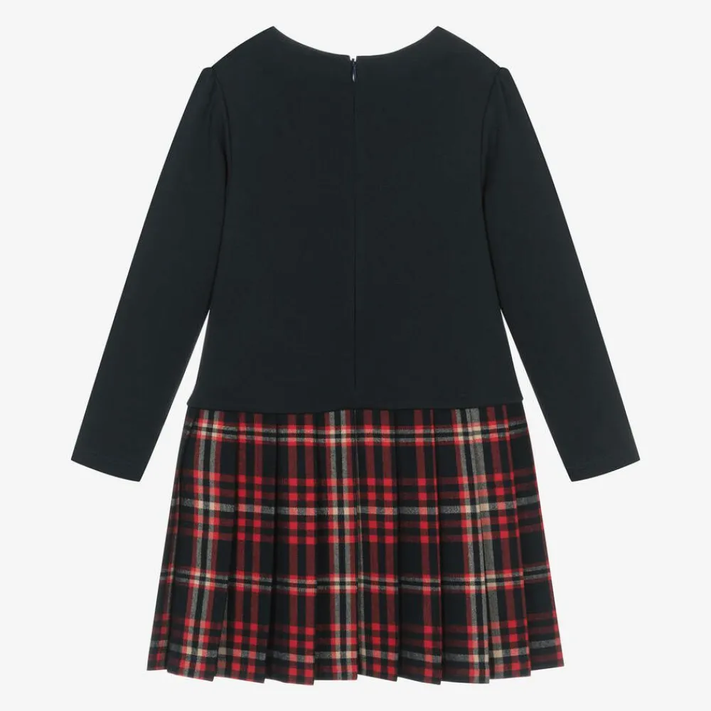 Smart navy blue and red dress for girls by traditional Portuguese brand Patachou. Beautifully soft and comfortable to wear, the bodice is made in cotton jersey and the pleated tartan skirt is made in brushed flannel. The bodice has a simple pleat detail on the front decorated with navy blue and red grosgrain ribbon bows, and the faux front pockets have gold-tone crest buttons for a stylish touch. A concealed zip fastening on the back completes the dress neatly.