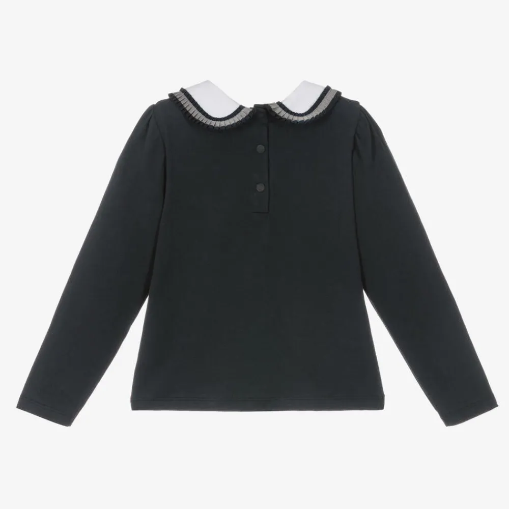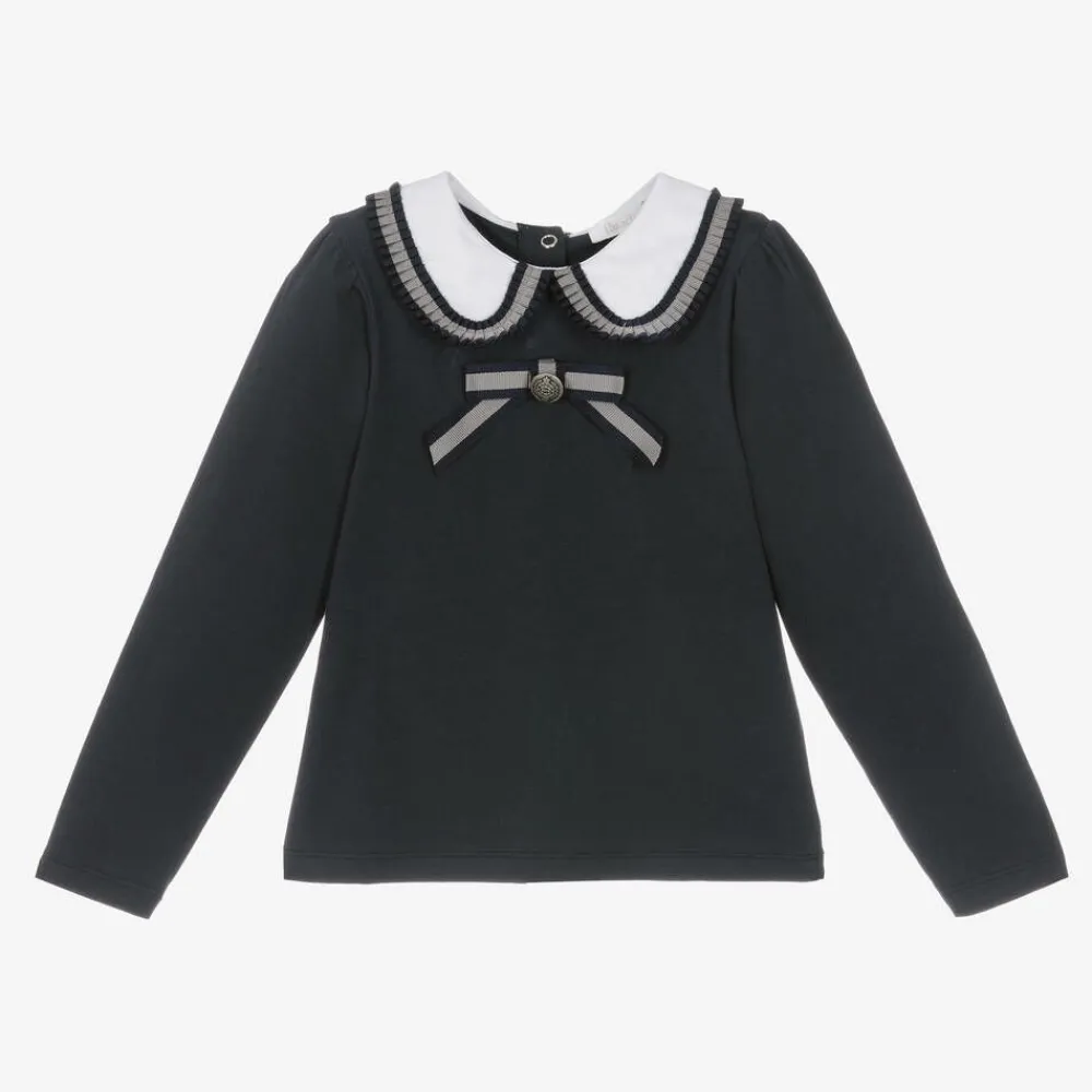 Exclusive to Childrensalon, a navy blue top for girls by Portuguese brand Patachou, made in soft and stretchy cotton jersey. For a classic look, this long-sleeved top has a white woven collar with a pleated blue and grey trim. A matching bow and crest button decorate the front and poppers fasten neatly on the back.