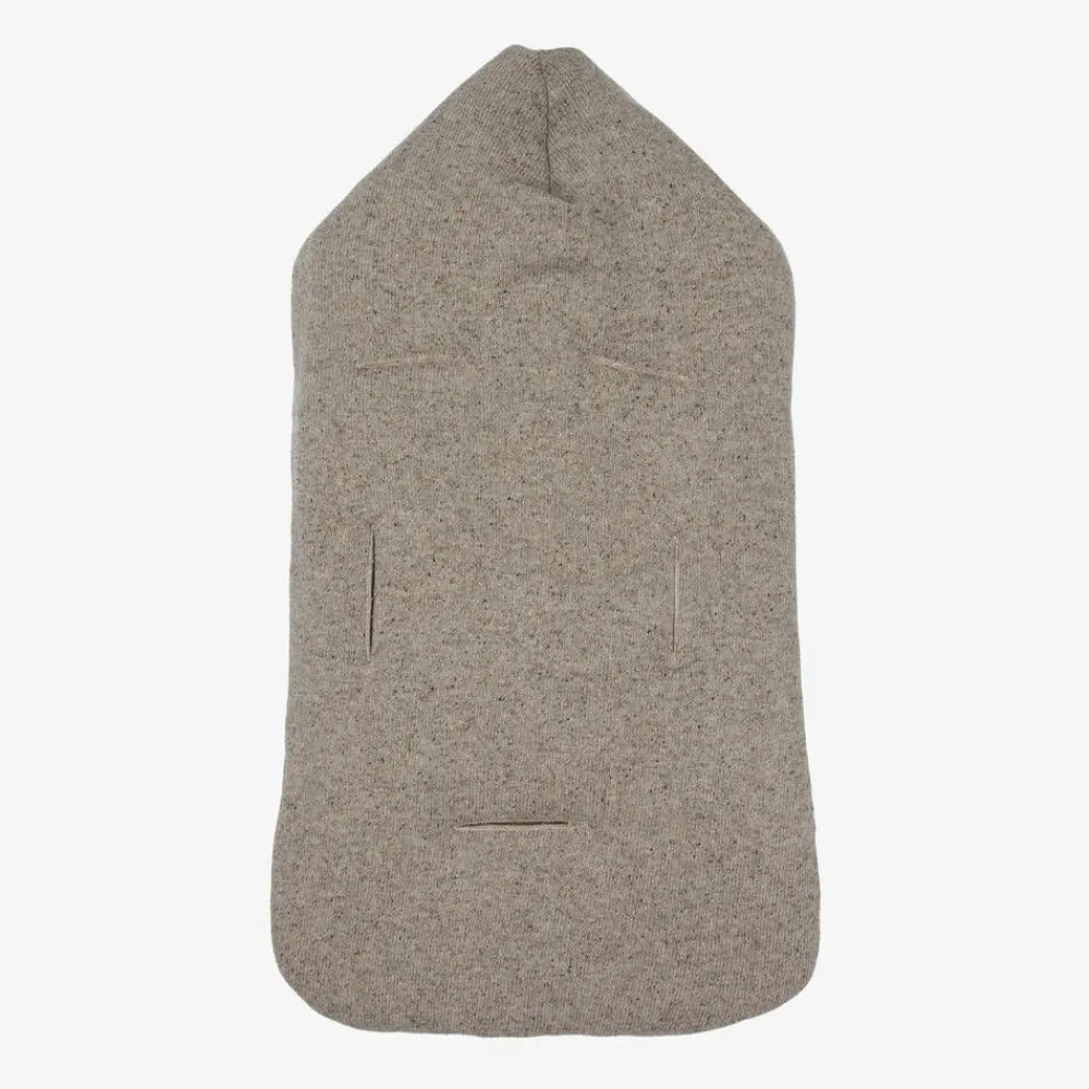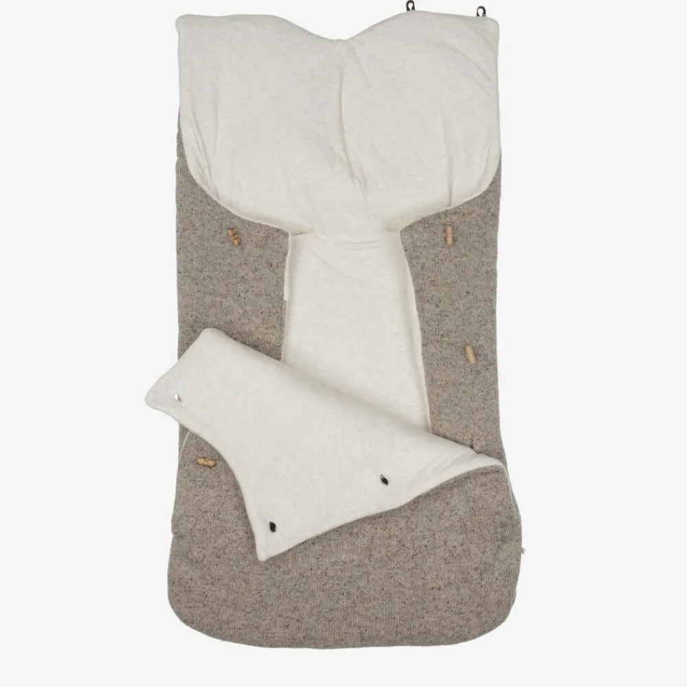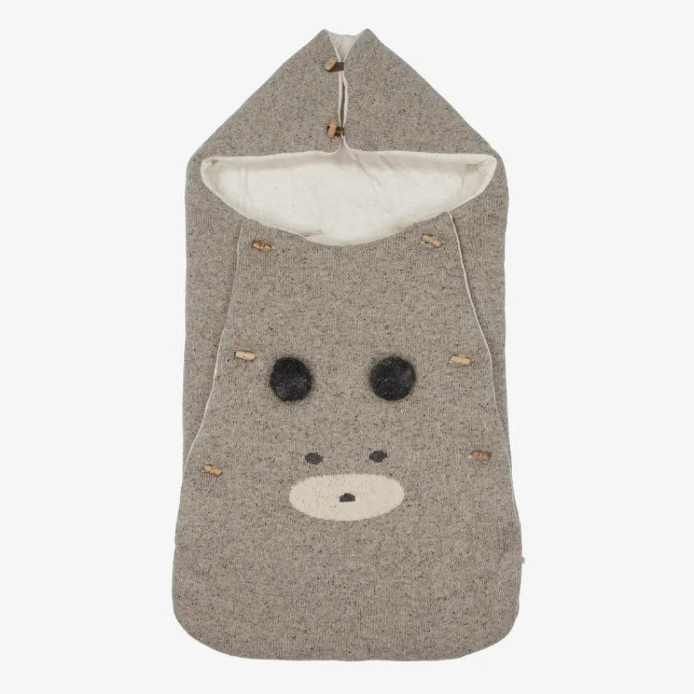 Beige marl knitted baby nest for boys and girls by Spanish brand Paz Rodriquez, with adorable teddy bear features on the front. Made in a luxuriously soft blend of wool and silk, the nest is softly padded for cosy comfort, and has a pale beige marl cotton jersey lining. Both the front flap and the hood secure with wooden toggles, and allows the hood to be unfastened and laid flat. There are useful openings on the back for easy use in car seat or stroller.