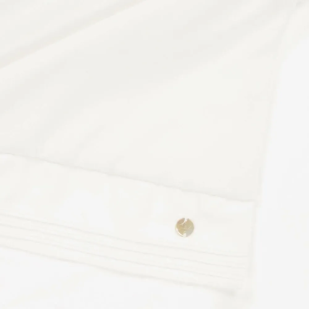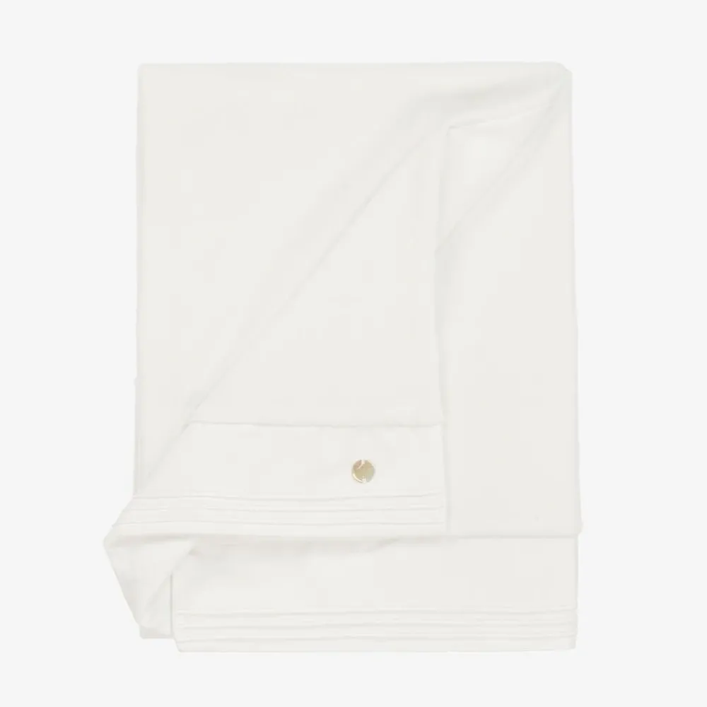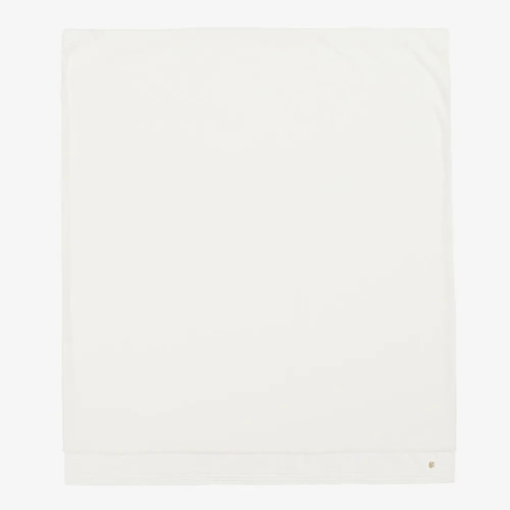 Ivory cotton blanket for baby boys and girls from Spanish brand, Paz Rodriguez. This cosy, double-layer blanket is made in super soft velour with comfortable ivory jersey on the reverse. For a lovely finishing touch, one end is edged with ivory twill and trimmed with a mother-of-pearl logo charm.