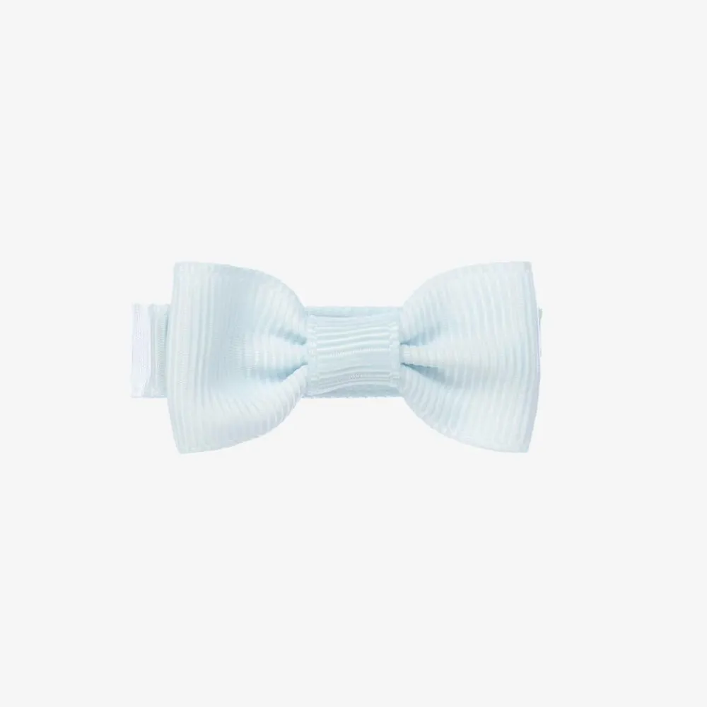 Girls pale blue handmade bow hair clip by Peach Ribbons. A finishing touch to an outfit, this sweet accessory is made in grosgrain ribbon and set on a metal clip.