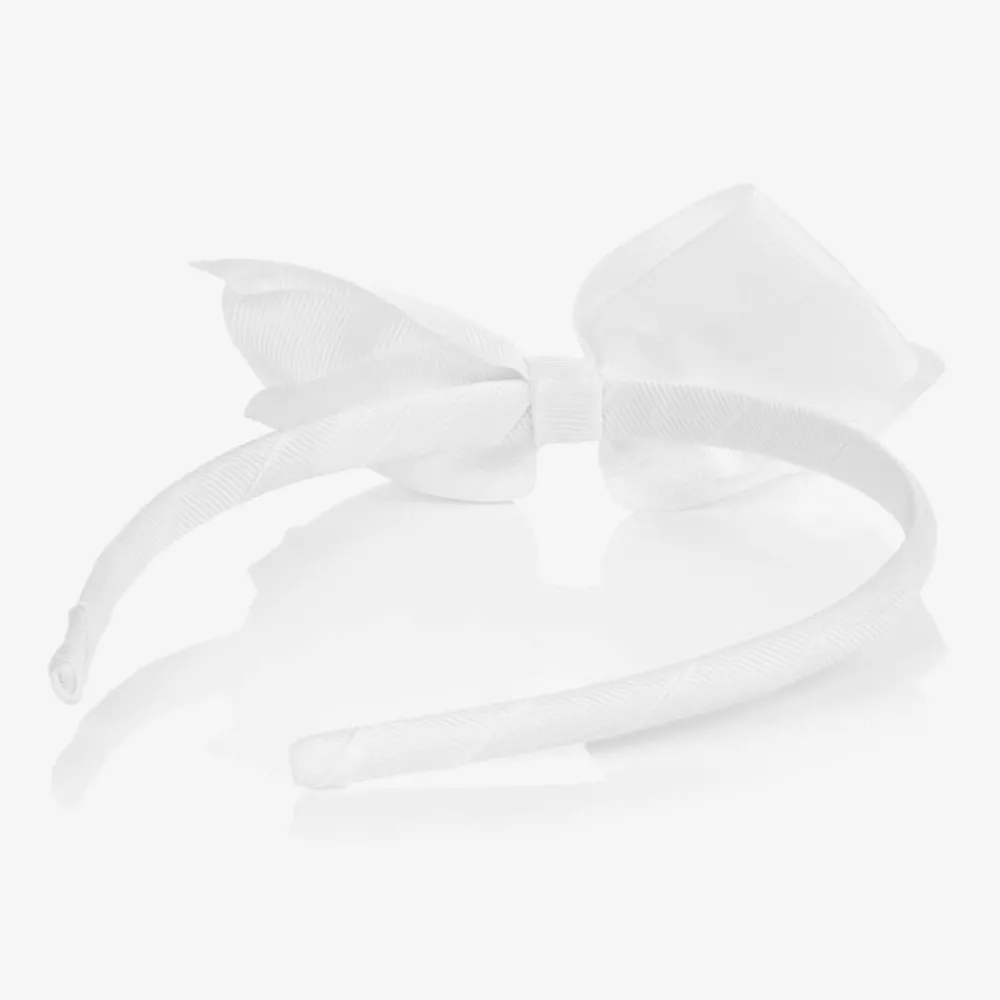 A lovely white hairband for girls from Peach Ribbons, ideal to complement an outfit beautifully. Wrapped with grosgrain ribbon, the flexible band is topped with a sweet bow.