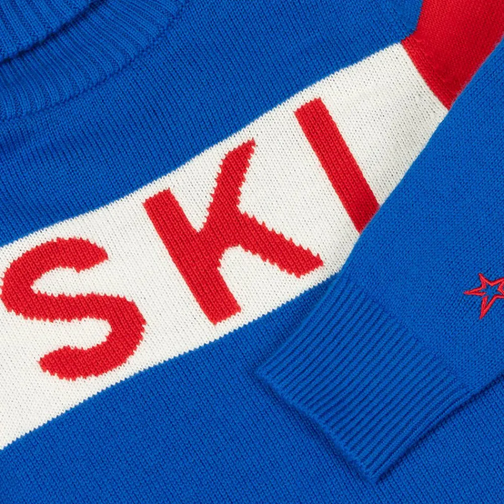 Blue roll neck sweater for boys and girls by Perfect Moment, with an aprés-ski-inspired style. Knitted in soft, extra fine Merino wool, it has an intarsia 'Ski' panel across the front and colourblock stripes on the sleeves. The brand's signature red star is embroidered above the cuff for a designer finishing touch.
