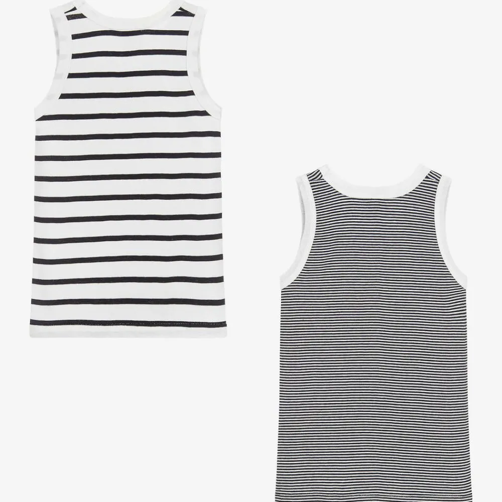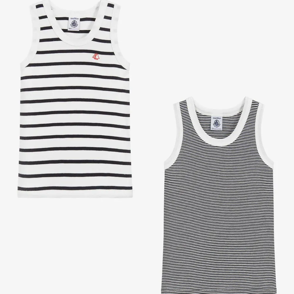 Pack of two navy blue and white striped sleeveless vests for boys by Petit Bateau. Made in soft and stretchy organic cotton jersey, one is white with wide navy blue Breton stripes and the brand's signature red sailboat logo printed on the chest. The other has very fine white and navy blue stripes and white trims around the neck and armholes.