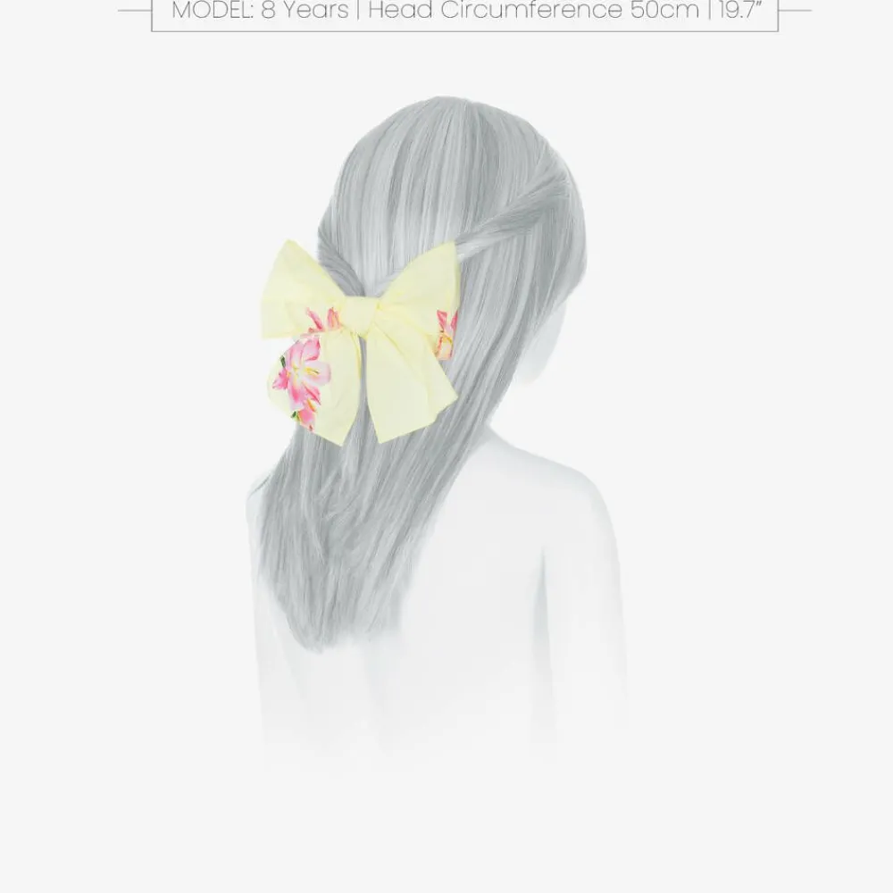 Pretty yellow and pink bow hair clip for girls by Phi Clothing, with a charming floral print. A lovely way to accessorise her outfit, it is made from lightweight cotton and sits on a metal crocodile clip.