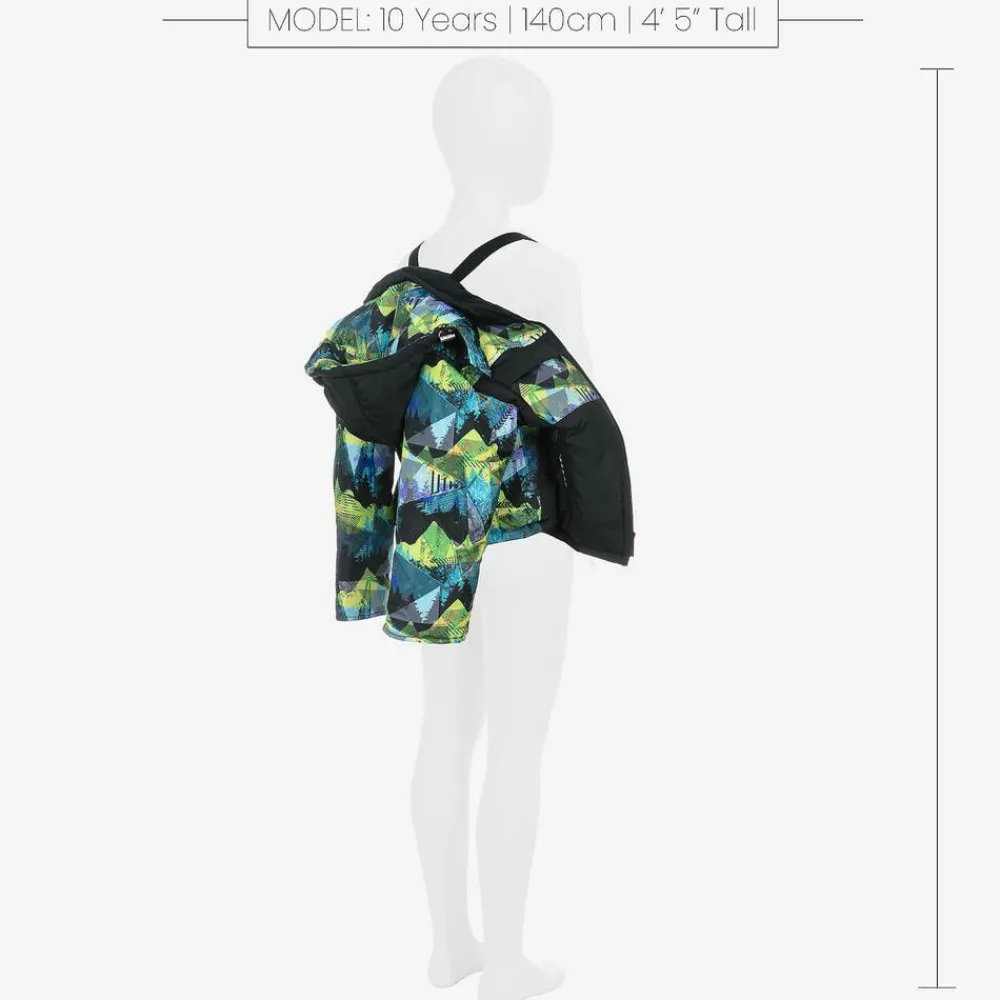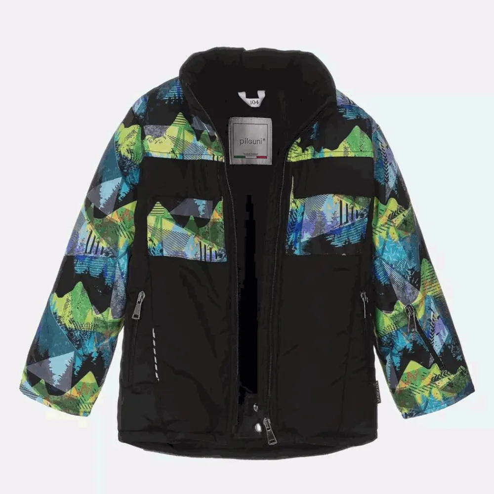 A cool black ski jacket for boys by Pilguni, with an eye-catching, abstract print in blue, yellow and black. Made in silky, water-resistant fabric, this zip-fastening jacket is padded with Isosoft technical insulation for superior warmth and performance. It has a cosy fleece lining with useful elastic straps for portability, and an elasticated, popper-fastening snow skirt. The detachable, padded hood has an adjustable toggle drawstring and the sleeves have cosy ribbed inner cuffs. There are four front pockets, including two secure zipped pockets and a further ski pass pocket on one sleeve. Light reflective trim on the front improves visibility and a logo tab on the side seam adds a branded finishing touch.