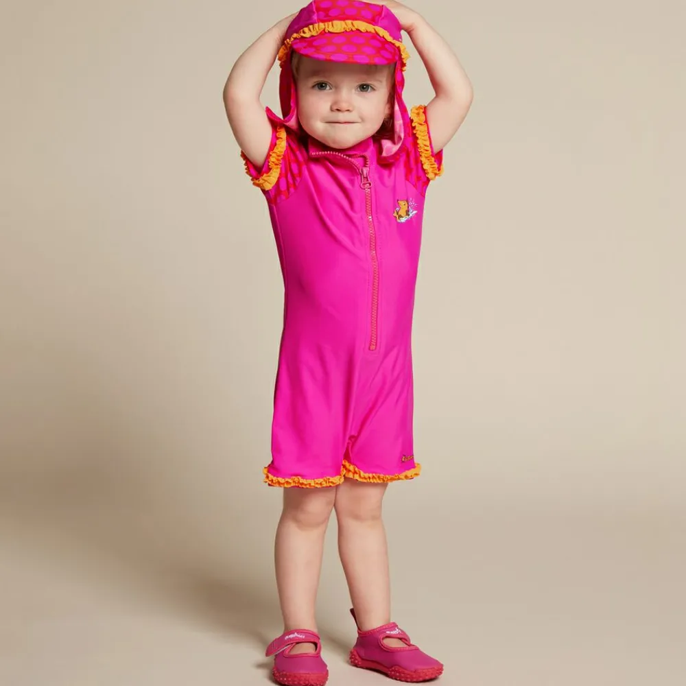 Little girls bright pink beach shoes by Playshoes, made in soft, flexible fabric with a wetsuit feel. With a slip-resistant rubber sole and a velcro strap fastening, these aqua shoes are comfortable for wearing on the beach or in and around the swimming pool.