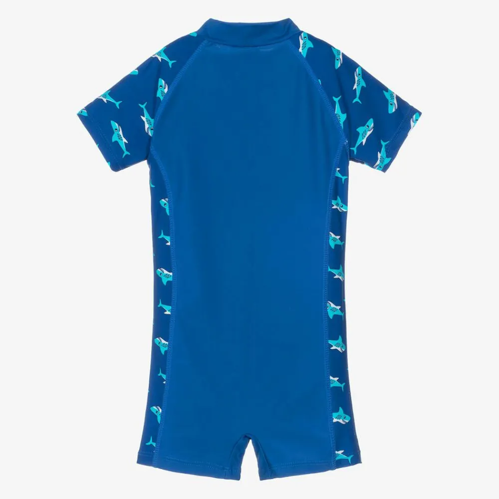 Little boys bright blue all-in-one sun suit by Playshoes, with cool shark print panels. With UPF 50+, this silky and stretchy one-piece fastens with a zip on the front for easy dressing, and is great to wear by the pool or on the beach.