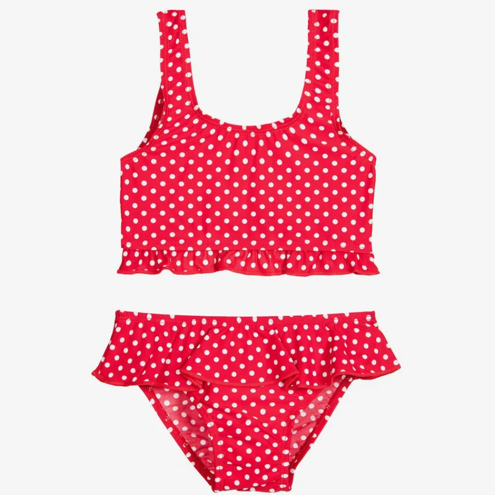 Girls red and white polka dot bikini by Playshoes, with UPF50+. Made in stretchy, silky lycra, this pretty two-piece is decorated with sweet frills on both pieces. Smaller sizes include a swim nappy.