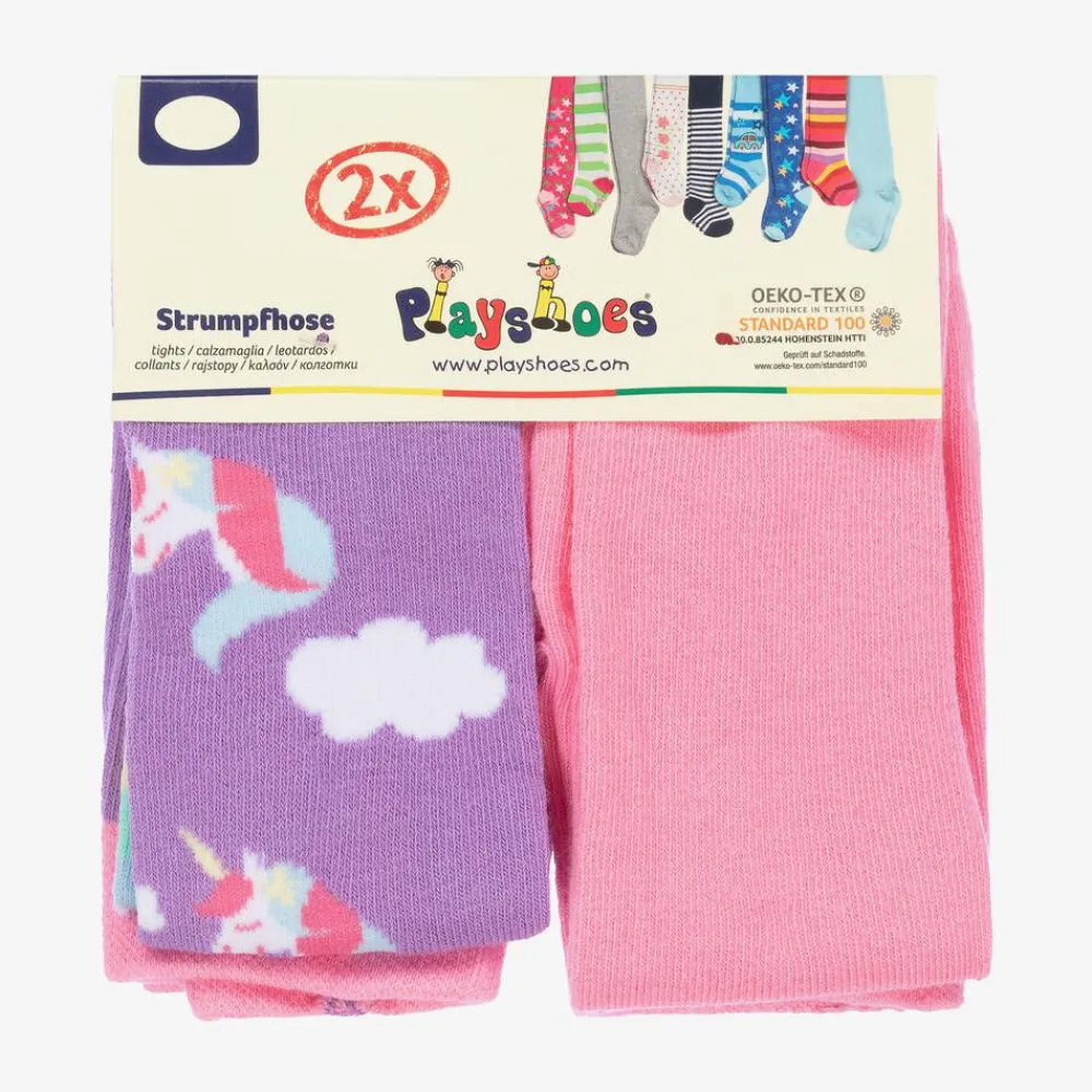 Two pairs of knitted tights for girls by German brand Playshoes. Made in a soft cotton blend, they are soft next to skin and are stretchy for a better fit. One pair is pink with a white logo on the waist and the other is purple with a sweet unicorn print and rainbow striped feet.