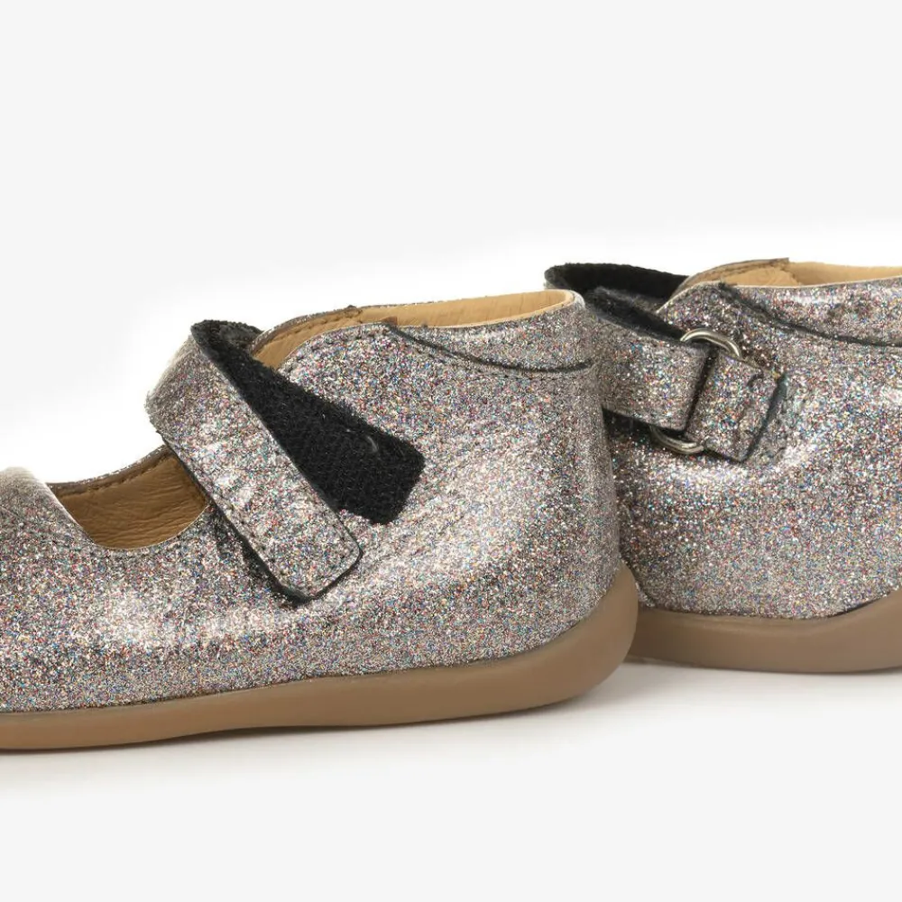 Sweet silver bar shoes for little girls by Pom d'Api, made in soft, supple leather. Designed for their first steps, these first-walkers have a super flexible rubber outer sole with a supportive anti-twist feature. The beautifully soft lining and insole ensure comfort, whilst the velcro strap across the foot helps with support. For a fun twist, they are covered in flecks of multi-coloured glitter.