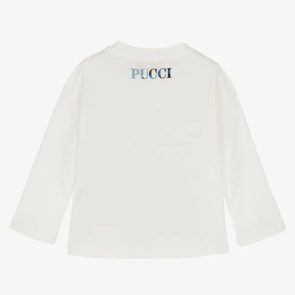 A white top for girls by Italian designer PUCCI, made in soft cotton jersey. The luxury brand, known for their vibrant, bespoke patterns, has styled this top with a blue, pink and black Onde-print patch pocket on the front and stand-out branding printed on the back. Poppers on one shoulder help with over-the-head dressing.