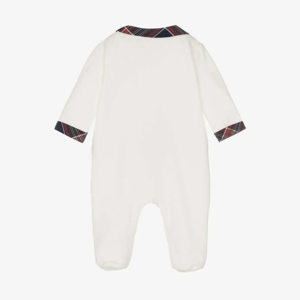 A charming ivory babygrow for boys by Pureté Du… Bébé. Made from super soft cotton-blend velour, there are navy blue and red tartan trims for a classic look. Fastening with poppers on the front and between the legs, it has a sweet pointed collar and a patch pocket on the chest with a mother-of-pearl logo charm.