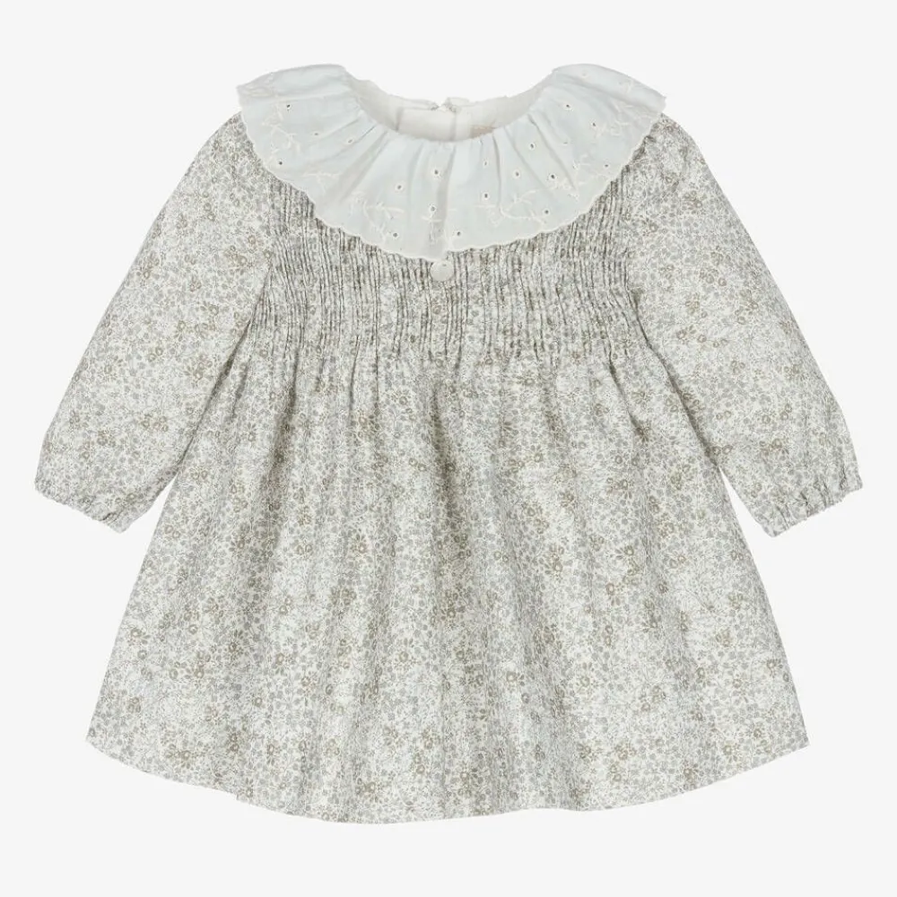 Lovely white cotton dress for younger girls by Pureté Du… Bébé, with a delicate green and blue floral design. This sweet dress has a pretty, white, ruffled, embroidered collar and a shirred bodice trimmed with a little mother-of-pearl logo charm. It has gently elasticated cuffs, a comfortable voile lining and fastens neatly on the back with a concealed zip.