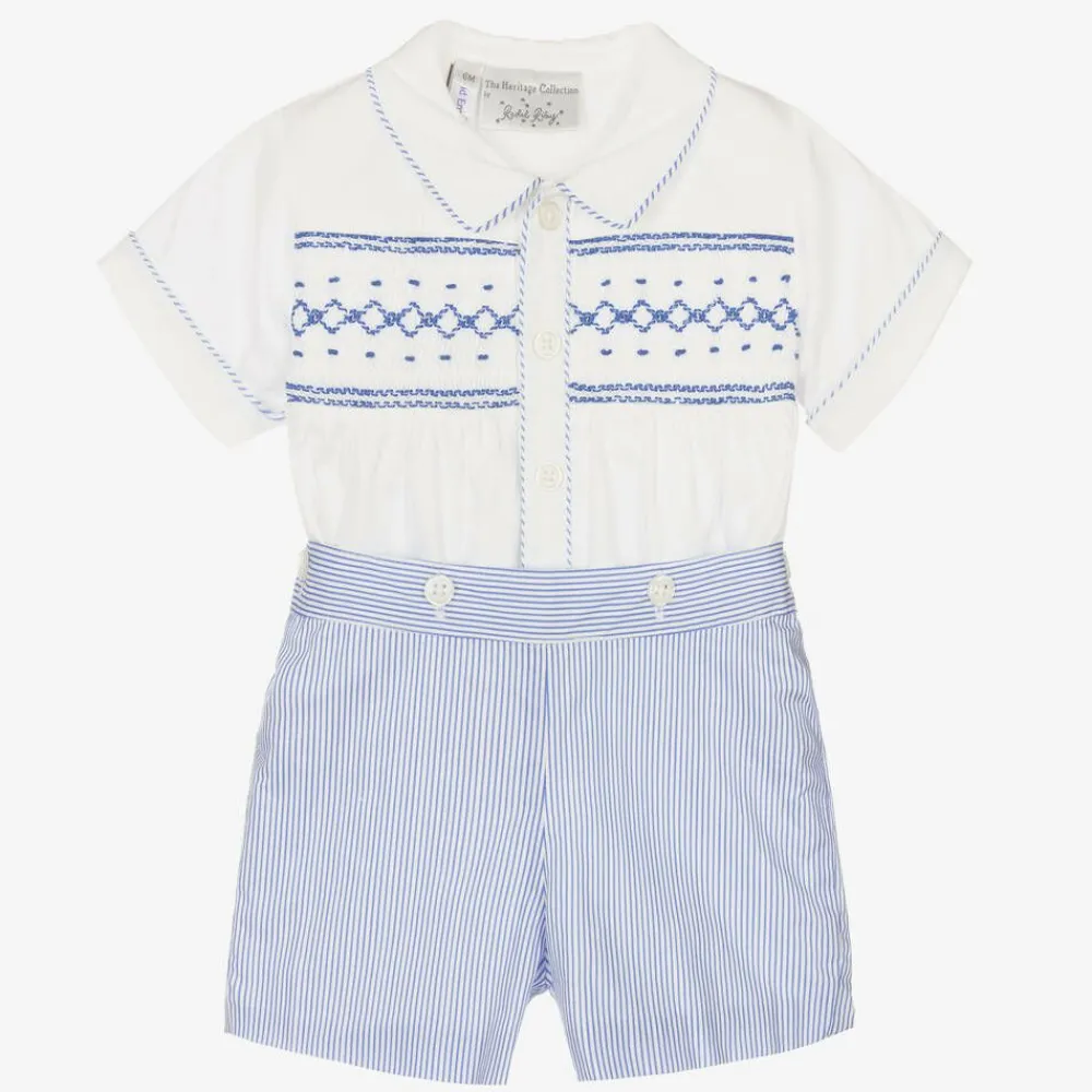 Pale blue and white lightweight cotton shorts set for baby boys by Rachel Riley. In a traditional style, the shirt has hand-smocking and blue embroidery across the chest. It has a Peter Pan collar, blue trims and fastens down the front with buttons. The stripy shorts fasten to the shirt with buttons, so it will always stay neatly tucked in.
