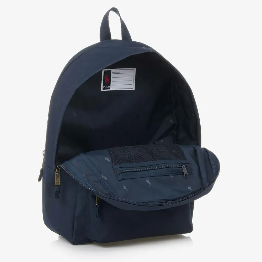 A spacious navy blue backpack for boys by Ralph Lauren, made in durable recycled canvas. It has two compartments, the main one has an internal mesh pocket and the other has a useful laptop pocket. There is an external zipped pocket on the front and a useful water bottle pocket on one side. Ideal for use as a school bag, it has padded, adjustable shoulder straps, with a buckle fastening chest strap for extra support. There is a subtle Polo logo on the back and the brand's signature pony logo embroidered on the front in red.
