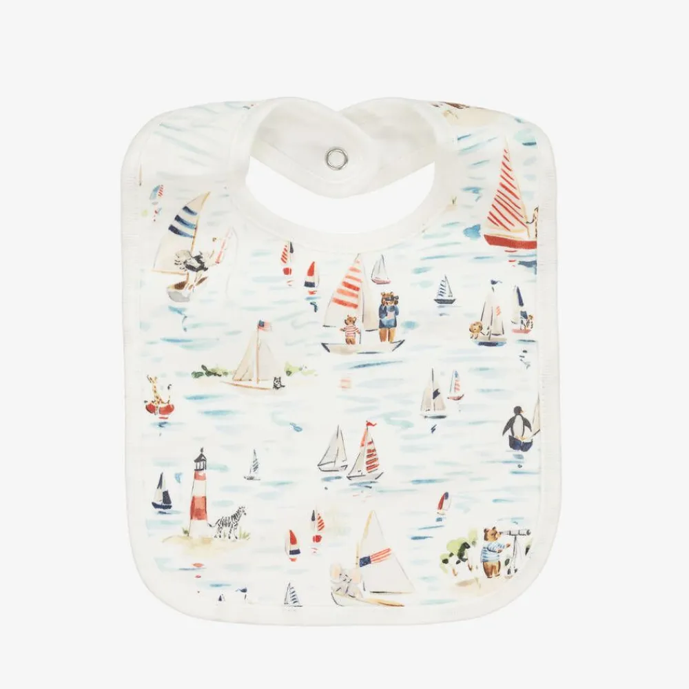 A sweet white bib for baby boys and girls by Ralph Lauren, made in soft cotton jersey. Illustrated by watercolourist Riley Sheehey, this feeding accessory is printed with a detailed sailboat and lighthouse design with friendly animals and blue waves incorporated into the nautical pattern. It fastens with a popper on the back of the neck and helps to protect their clothes from any dribbles and spills.
