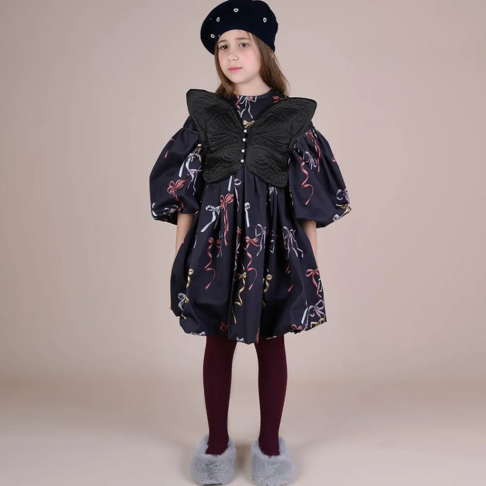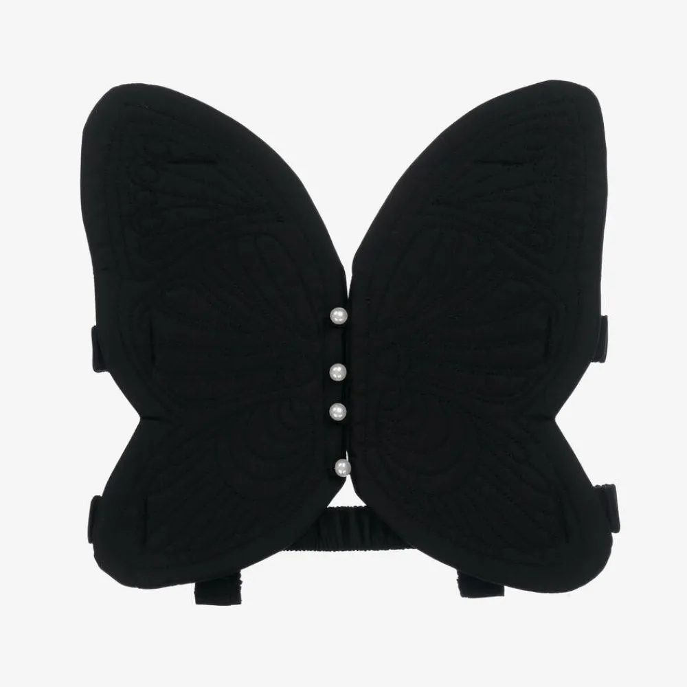 A black butterfly-shaped top for girls by British brand RaspberryPlum. This lovely dressing-up accessory is made in silky smooth fabric, with beautiful embroidery detailing. It has faux pearl button fastenings down the front, with elasticated back straps for comfortable wear.