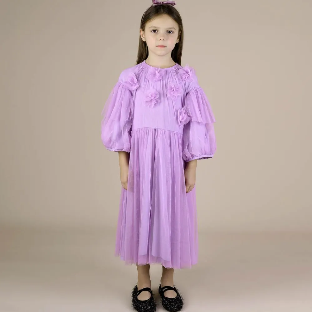 In a lovely shade of lilac purple, this beautiful RaspberryPlum dress for girls is ideal for a party or special occasion. Made in soft tulle, it has appliquéd tulle flowers on the bodice and purple velvet trims on the back, with a gorgeous ruffle on the elegant three-quarter sleeves. Lined in lightweight viscose for comfort, the dress fastens on the back with a concealed zip and pretty velvet ties.