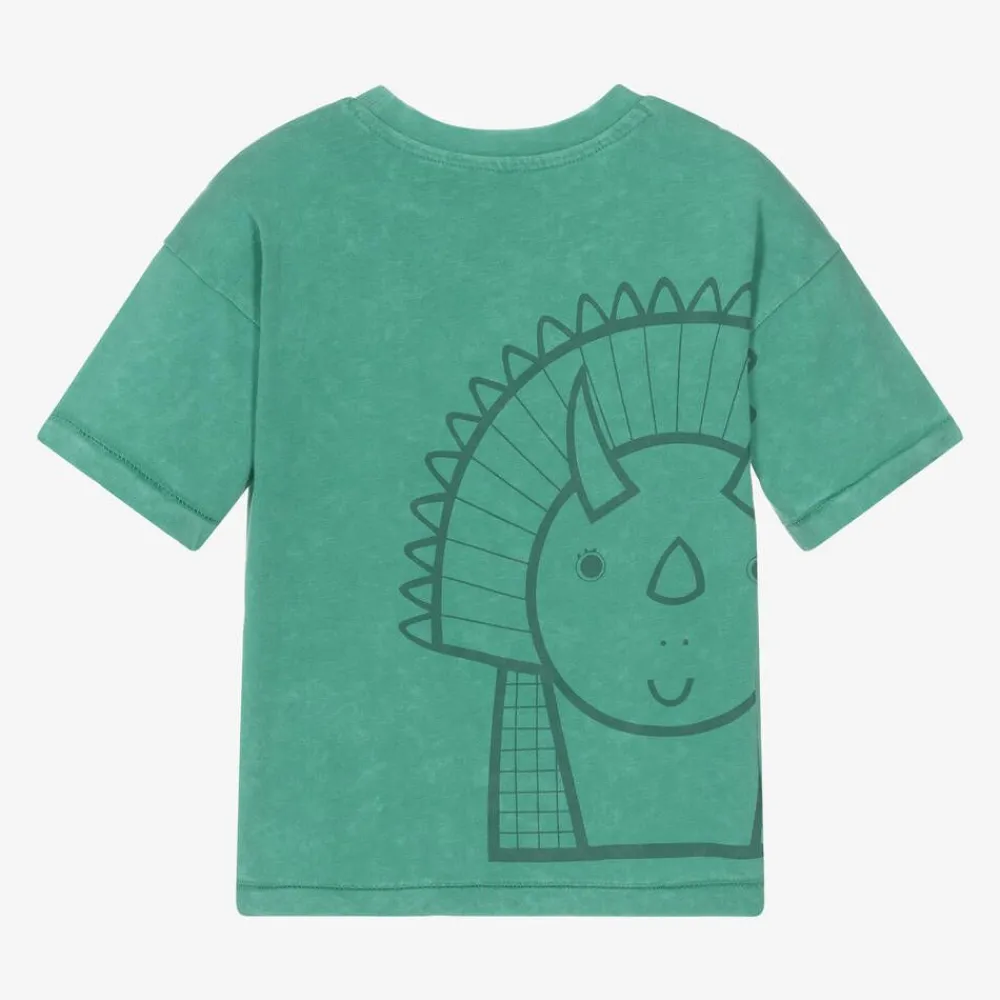 Green, organic cotton T-shirt for boys and girls by Roarsome, made in soft slub jersey with a cool washed effect. An oversized, drop-shoulder fit, this casual tee features the brand's Spike the Dinosaur print on the back and 'Roarsome adventure club' on the front.