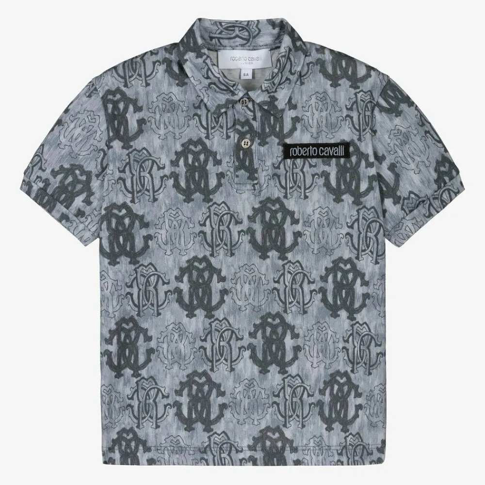 Blue polo shirt for boys by luxury Italian brand Roberto Cavalli, made in soft cotton jersey. For a distinctive look, it is patterned in the designer's recognisable RC monogram, with a logo tab stitched on the chest. It has a pointed collar and fastens with silver metal branded buttons at the front.